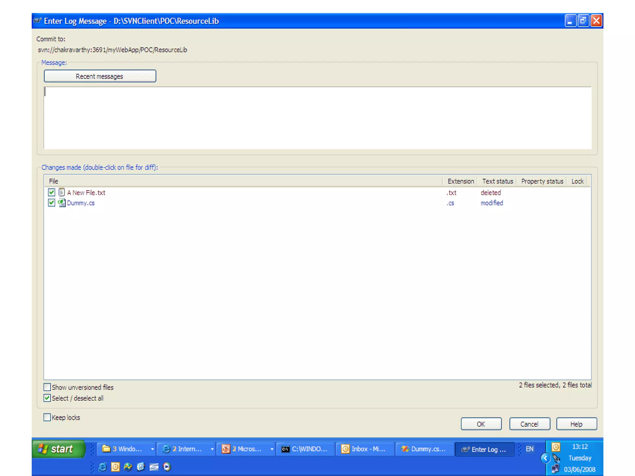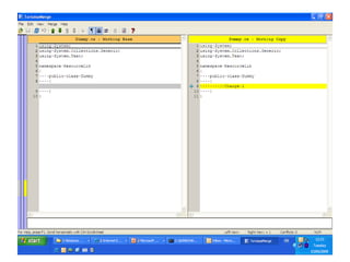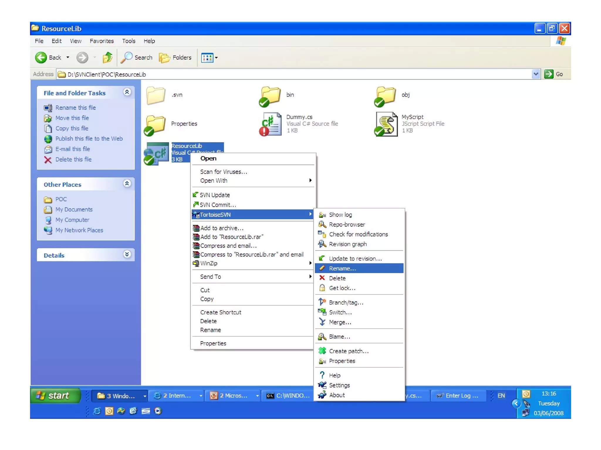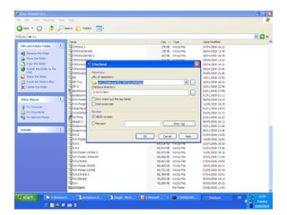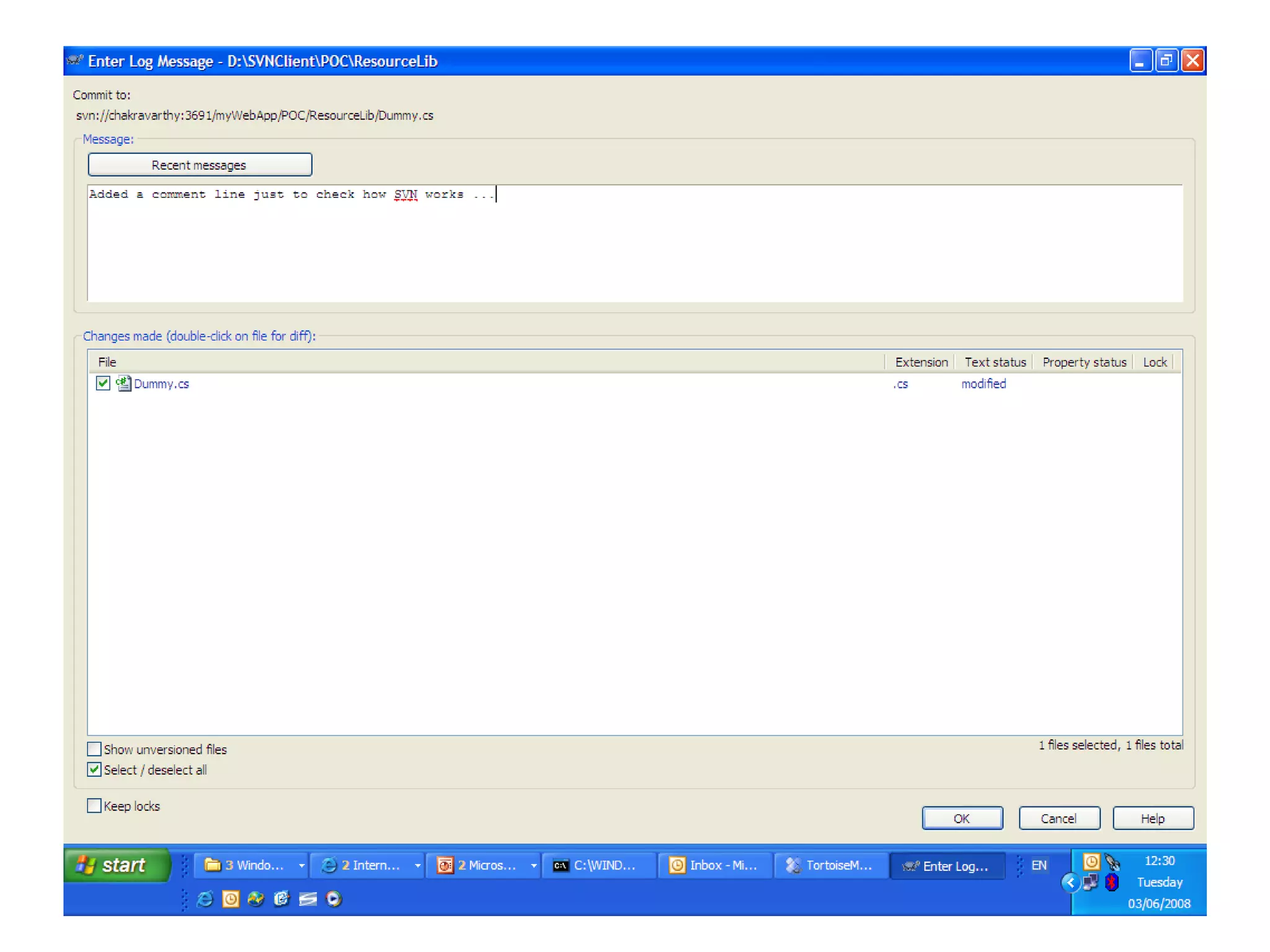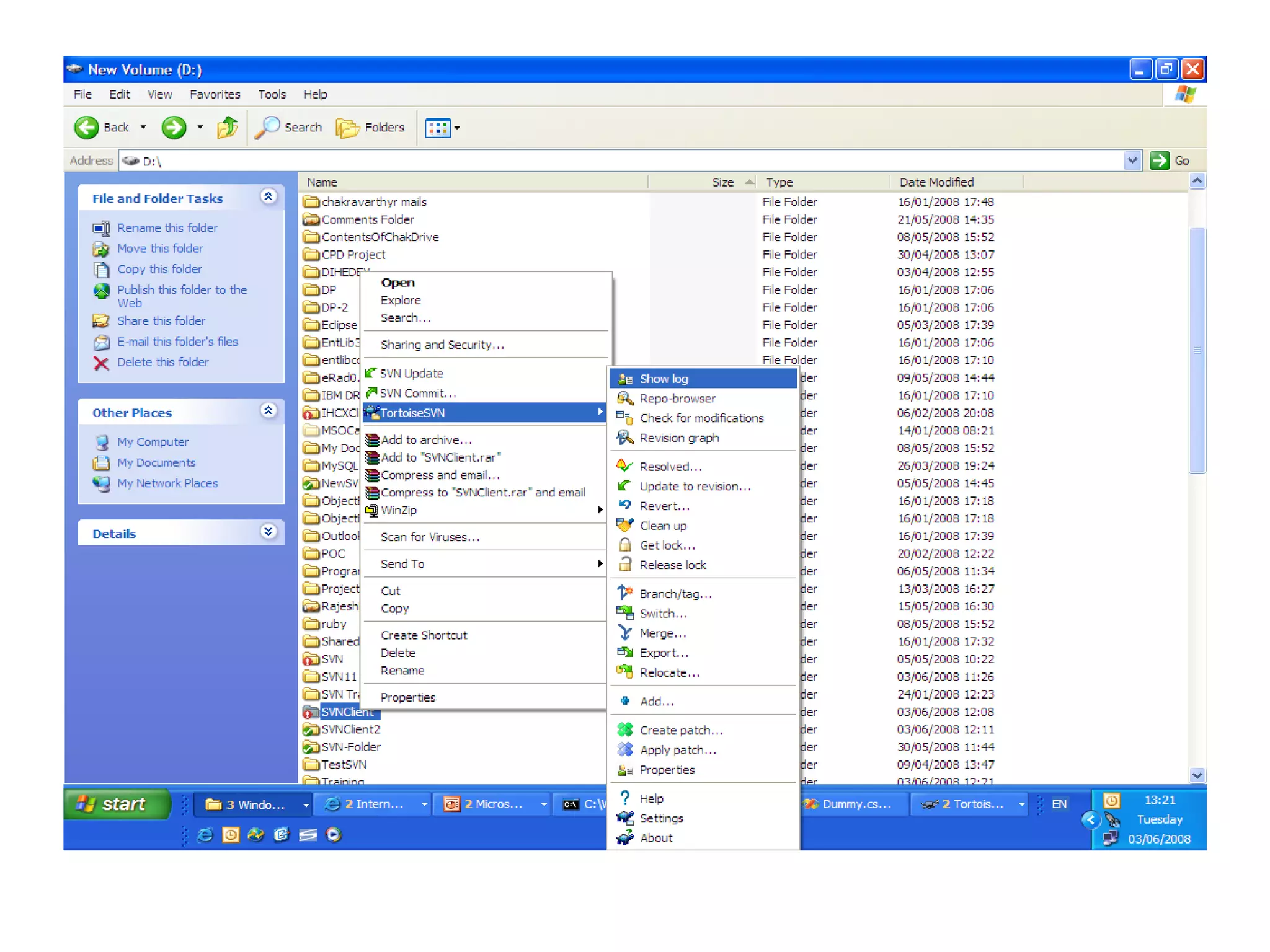 This document provides instructions on how to use the TortoiseSVN client to interact with a Subversion repository. It describes how to checkout a working copy from the repository, make changes to files, commit changes back to the repository, resolve conflicts, and view the history of changes. It also provides definitions for common Subversion terms like commit, update, merge, and working copy.