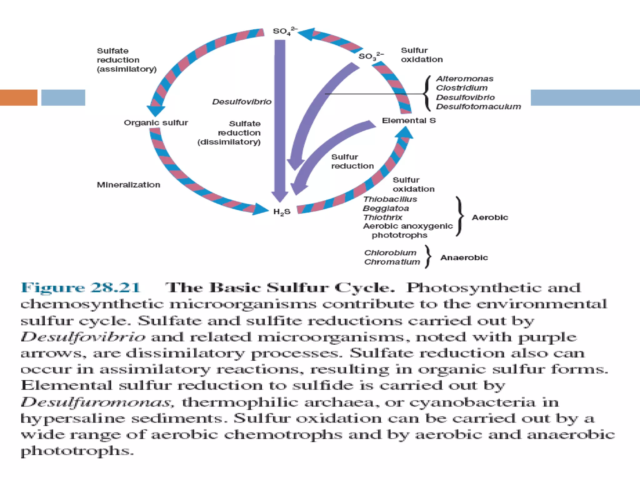 Sulphur cycle  Microorganismscontribute greatly to the sulfur cycle.  Photosynthetic microorganisms transform sulfur by using sulfide as an electron source, allowing Thiobacillus and similar chemolithoautotrophic genera.  In contrast, when sulfate diffuses into reduced habitats, it provides an opportunity for different groups of microorganisms to carry out sulfate reduction.  For example, when a usable organic reductant is present, Desulfovibrio uses sulfate as an oxidant.  This use of sulfate as an external electron acceptor to form sulfide, which accumulates in the environment, is an example of a dissimilatory reduction process and anaerobic respiration.