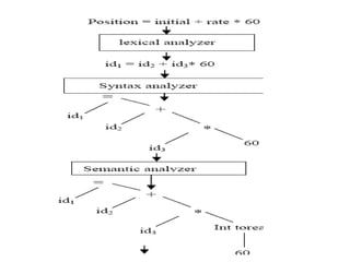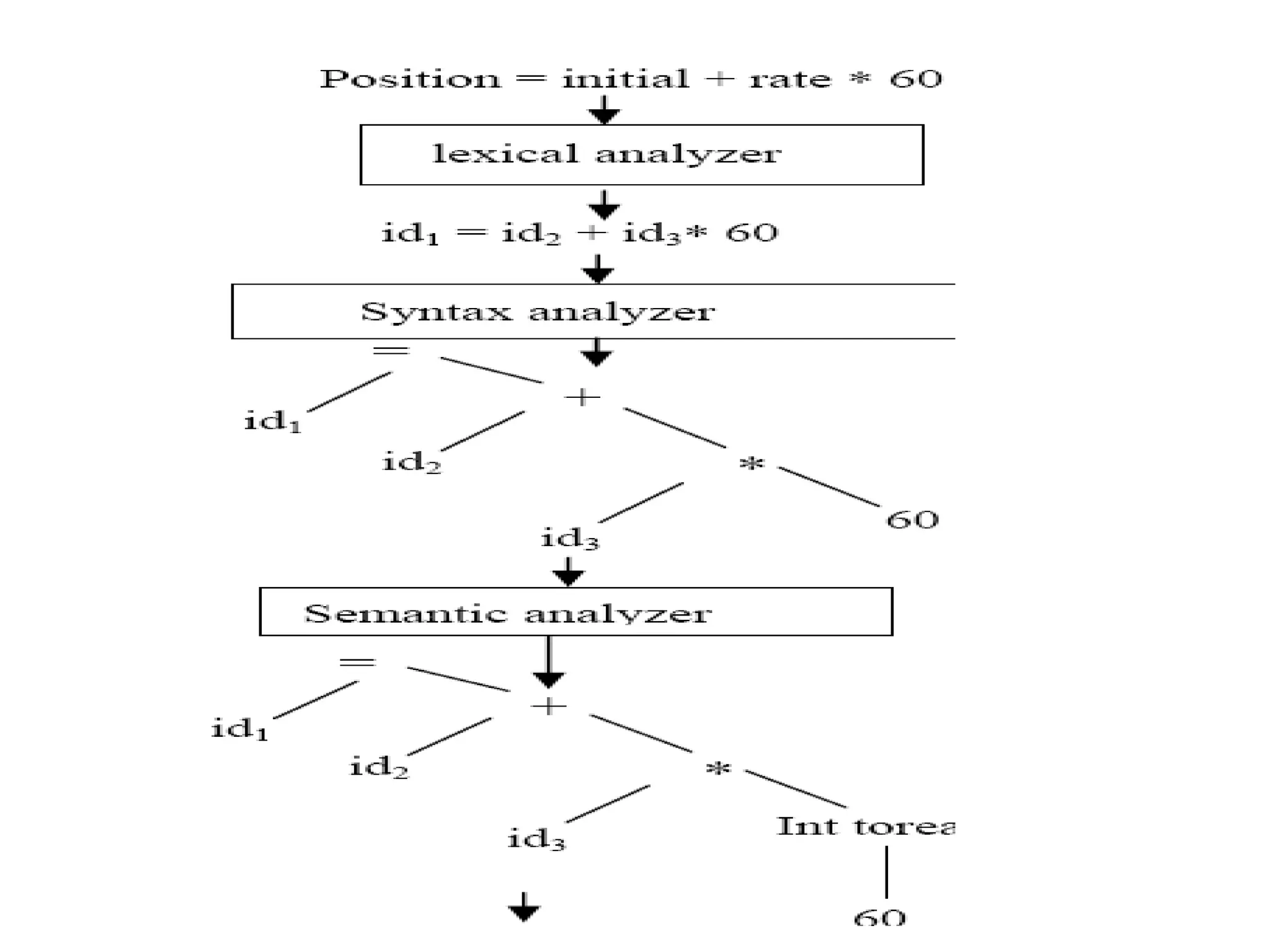 • Analysis ofsource text – Lexical Analysis (Scanner) – Syntax Analysis (Parser) – Semantic analysis. • Synthesis of target text – Storage allocation – Code generation