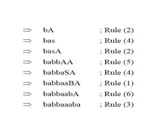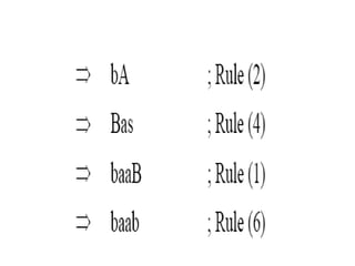 • Production :-It is called as re-writing rule • It can be represented as :- – Each production consists of a No terminal followed by an arrow (-) or equal to (=), followed by string of Non terminals and terminals – Ex:- A  b S  Aa