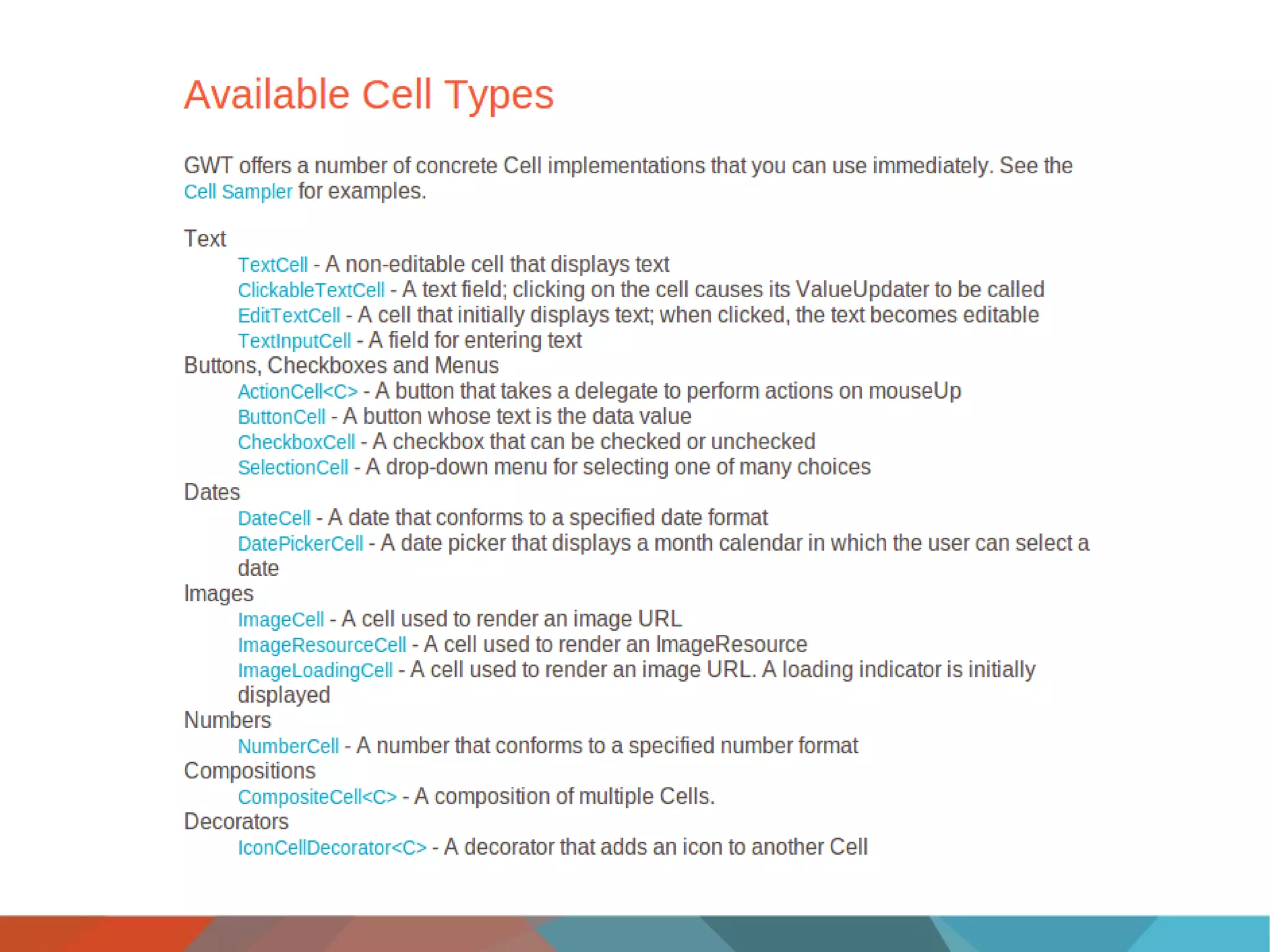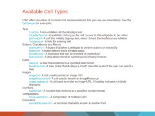 This document discusses using cell-based widgets in GWT for displaying tabular data. It covers the main cell-based widgets like CellList and CellTable, customizing cells and styles, selection models, paging data with data providers, custom headers and footers, using them as editors, adding drag and drop support, and combining them into composite widgets. The key points are that cell-based widgets are lightweight for rendering large data, customizable via custom cells and styles, support features like selection and paging, and can be extended for additional functionality.