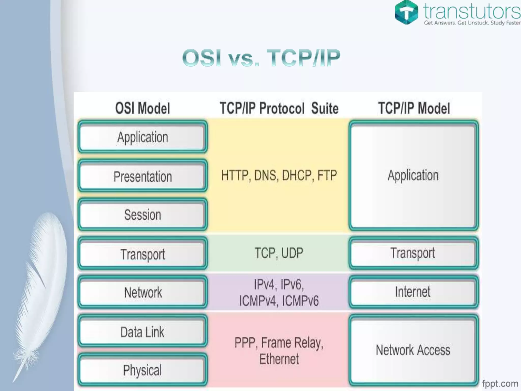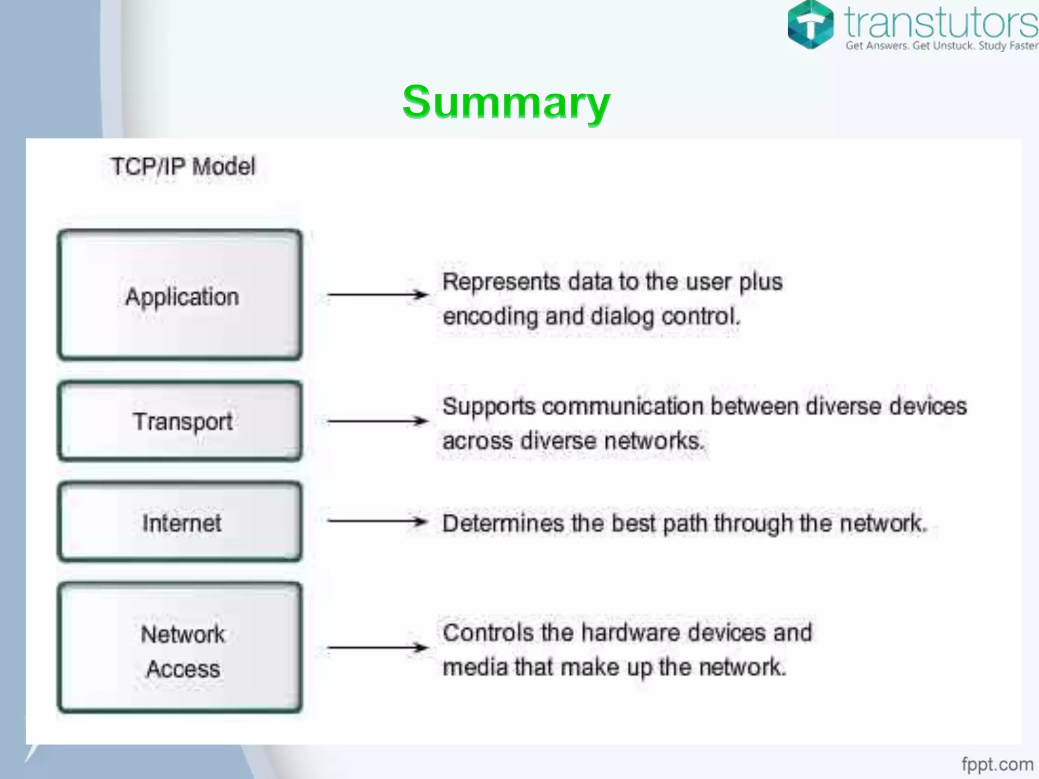 The TCP/IP model is a set of communication protocols used for the internet, named after its primary protocols: Transmission Control Protocol (TCP) and Internet Protocol (IP). It consists of five layers, with the application layer at the top, responsible for data coding, and the transport layer managing packet transportation. Unlike the OSI model, which has seven layers and supports both connectionless and connection-oriented communication, the TCP/IP model supports only connectionless communication.