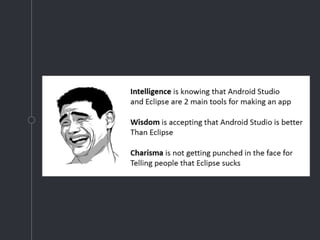 The document provides an overview of key Android app development concepts including activities, services, broadcast receivers, content providers, the activity lifecycle, asynchronous tasks, SQLite database usage, and Google Maps integration. It discusses how activities represent screens, services run in the background, broadcast receivers respond to system broadcasts, and content providers share data between apps. It also covers the activity lifecycle, asynchronous tasks, SQLite database implementation using SQLiteOpenHelper, and steps to add a map with markers to an app using the Google Maps Android API.