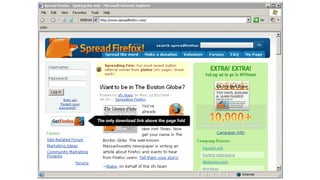 Firefox Context (2) •Initial Disruption Period of Fx 1.0 diminishing • IE 7 and Safari on Windows • iTunes has been disruptive; might an iTunes- focused Safari be the next disruptive event? • What do we do to maintain momentum / motivate our community?