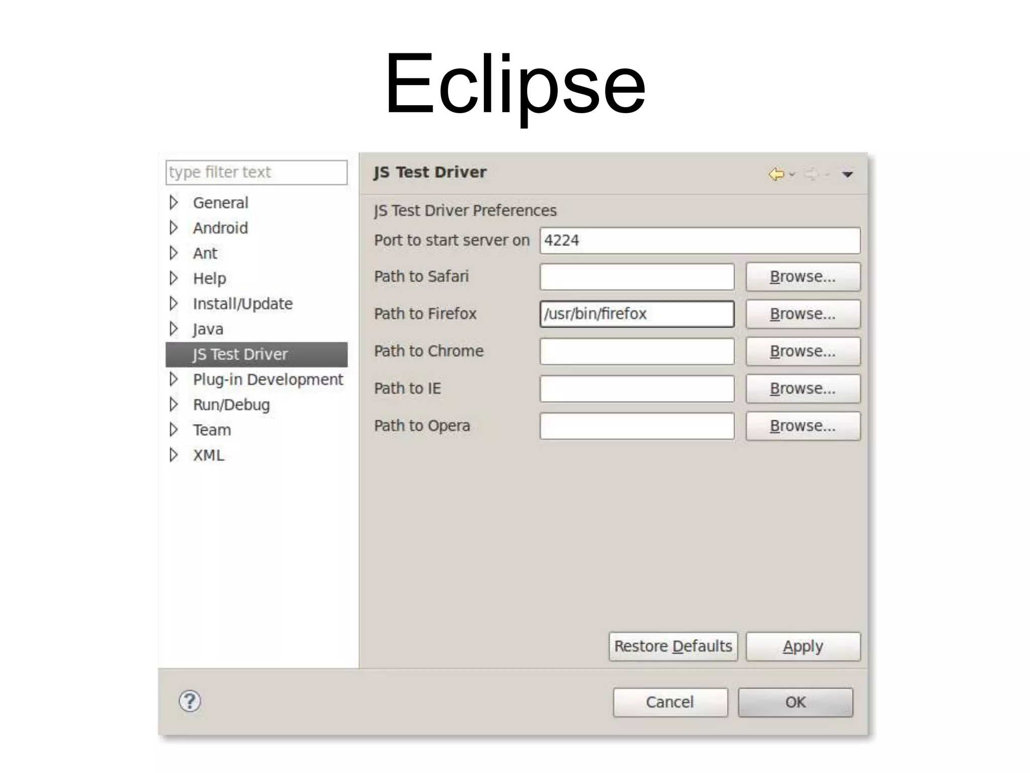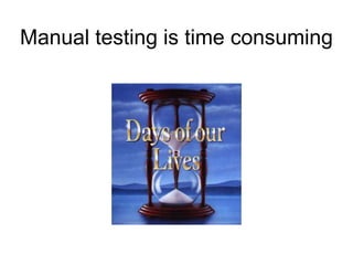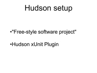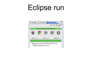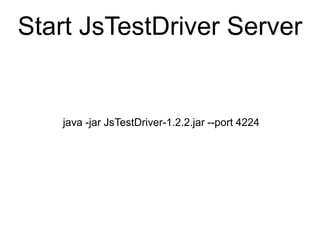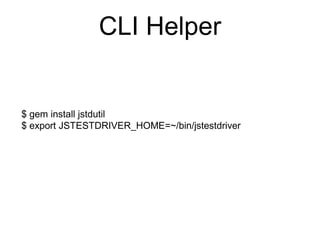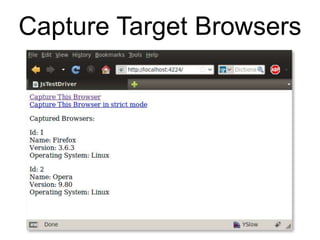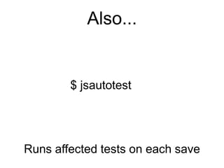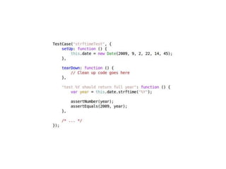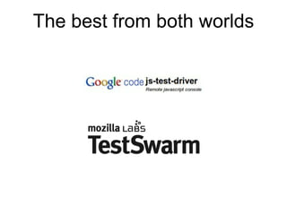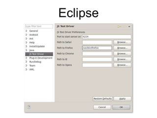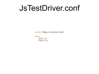 This document discusses test-driven development for JavaScript using various testing frameworks like YUI Test, JSpec, and JsTestDriver. It covers how to set up unit testing for JavaScript, challenges like testing asynchronous code and events, and strategies for addressing those challenges using tools like Sinon.js for stubs and mocks. The document also provides examples of testing a chat client application and integrating JavaScript testing into a continuous integration workflow using Hudson.