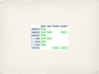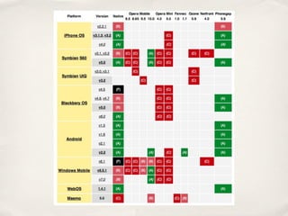 This document discusses the challenges and strategies for mobile web development, highlighting the importance of cross-browser support for popular mobile platforms. It covers the need for comprehensive testing, the selection of devices and simulators, and assessing browser capabilities. The author emphasizes data-driven insights and outlines a proposed testing strategy along with recommendations for necessary hardware investments.