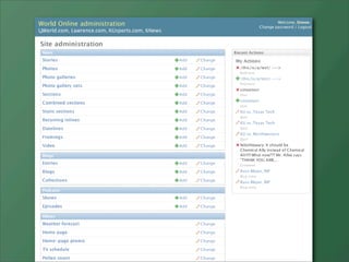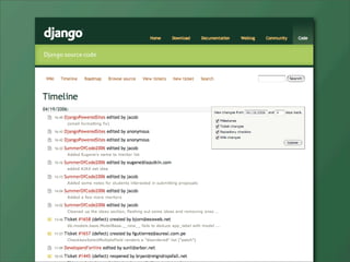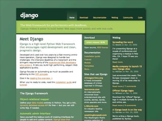 The document summarizes the Django web framework. It describes key characteristics like clean URLs, loosely coupled components, and designer-friendly templates. It outlines components like URL dispatching, views, models, templates, forms, validation, administration, internationalization, and success stories. Django allows for really fast development, reuse of components, and less code through its architecture and features.
