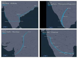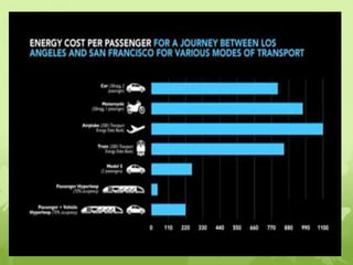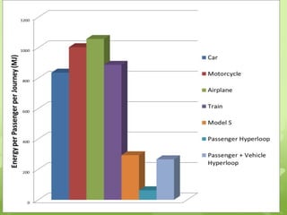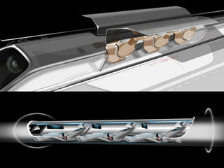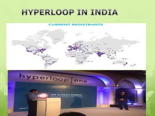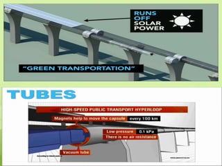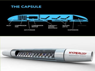 The document discusses the concept of a proposed high-speed transportation system called Hyperloop. The Hyperloop would use pods traveling in low pressure tubes to transport passengers and goods at airline speeds but at lower costs than existing high speed rail. It would work using solar power and accelerated magnetic levitation to reach top speeds of over 1200 kmph. Several companies are currently working on developing the technology and constructing prototype Hyperloop systems.