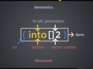 - Clojure focuses on simplicity, empowerment, and expressiveness through features like pure functions, immutability, and consistent syntax.