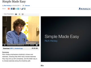 The document summarizes some of the key ideas and philosophies of the Clojure programming language as presented by Randy Lien. Some of the main points covered include: