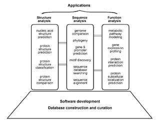 The document outlines an introductory bioinformatics course, including practical lab sessions, specific topics such as sequence alignment and genomic analysis, and evaluation methods based on assignments. It describes the history and development of bioinformatics, differentiating it from computational biology, while highlighting its significance in biological research and applications like drug design and forensic analysis. Additionally, it provides resources for bioinformatics tools, databases, and assignments for students to explore and utilize in their research.