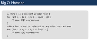The document discusses the analysis and design of algorithms, focusing on time complexity through worst, average, and best case scenarios. It explains different notations such as Big O, Omega, and Theta for expressing time complexities, as well as examples of linear search in different cases. Additionally, it covers how to combine time complexities of loops and provides insight into specific time complexity calculations.