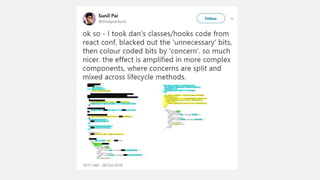 This document discusses React hooks, an experimental feature for managing state and side effects in functional components, highlighting their benefits and use cases. It covers built-in and custom hooks, their rules, and how they enhance code reusability without breaking existing functionality. The document also references essential concepts in React, such as components and state management, while providing links to further resources.
