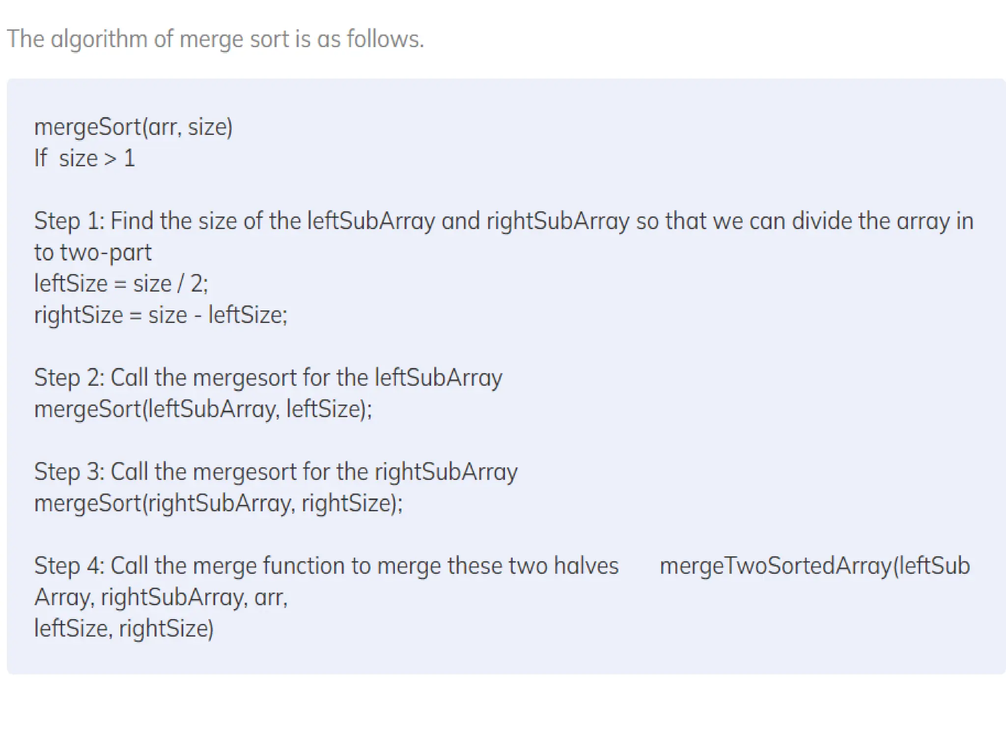 Step 4: Call the mergeSort function on the part (low, mid) and (mid+1, high).