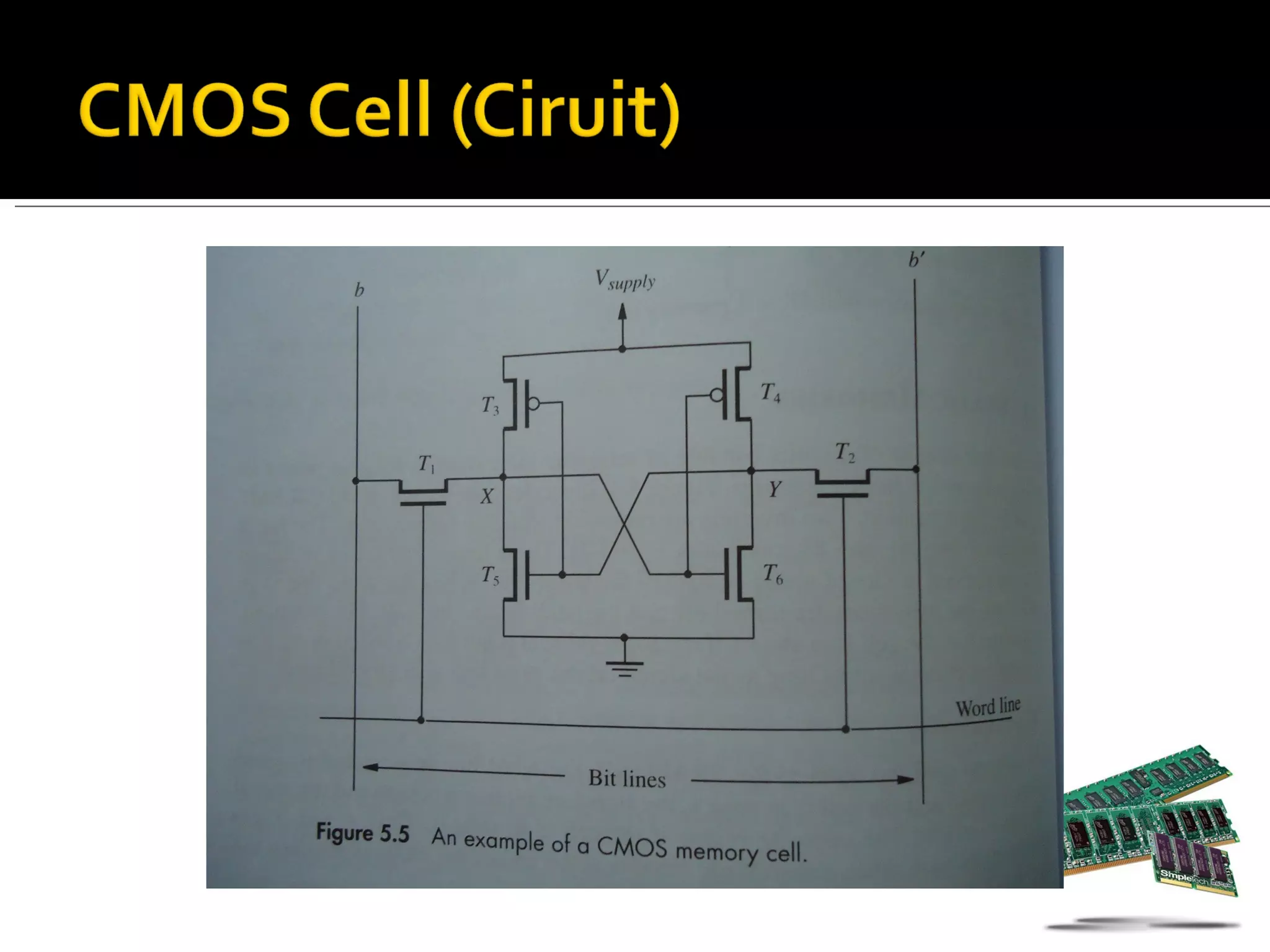 The cell is connected to one word line and two bits lines by transistors T1 and T2
