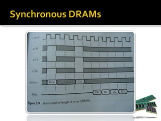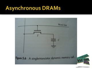 The document discusses the organization and operation of dynamic random access memory (DRAM). DRAM uses capacitors to store bits of data in memory cells that must be periodically refreshed. It describes how DRAM cells are arranged in a grid structure with rows and columns, and how row and column addresses are used to access individual cells. The document also explains techniques like fast page mode that allow for faster access to blocks of data within the same row without needing to reselect the row address.