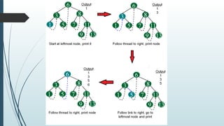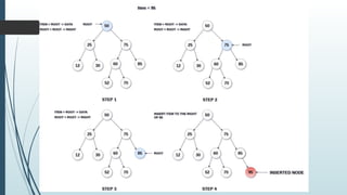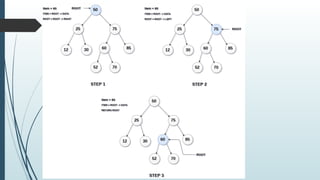 The document discusses non-linear data structures, particularly trees, including types like binary trees, binary search trees, AVL trees, and B-trees. It covers tree terminologies, representation methods, traversal algorithms (in-order, pre-order, post-order), and various tree operations such as insertion, deletion, and searching. Additionally, it details applications of these structures, including heaps and expression trees, and highlights the advantages of using binary search trees for efficient searching and data management.