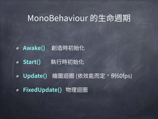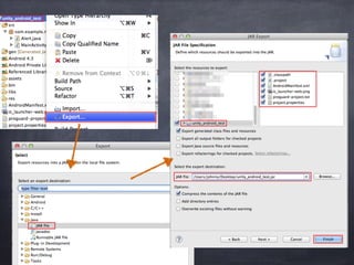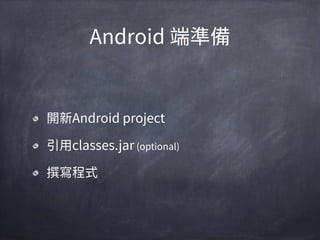 The document discusses how to create a Unity plugin for Android. It covers Unity concepts like GameObjects and Components. It then discusses how to implement an Android plugin in Unity using C# and Java interfaces. It provides examples of using AndroidJavaClass and AndroidJavaObject to call Java methods from Unity scripts. It also covers file packaging and some considerations like plugin file locations. The presentation includes questions and references additional Unity and plugin development resources.
