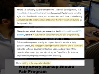 This document discusses pair programming and provides guidance on how to effectively implement it. It begins by explaining the purpose of pair programming is to produce high quality software. It then discusses various pairing techniques like ping-pong pairing and mob programming. The document also identifies benefits like higher quality code and faster defect removal, as well as challenges like being tiring. Finally, it provides tips for making pairing work well such as starting with a defined task, switching roles frequently, and not forcing people who strongly dislike pairing.