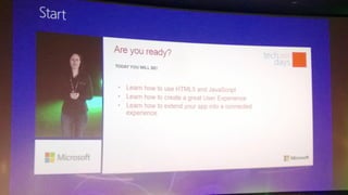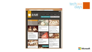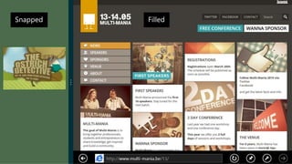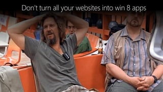 This document discusses how to build Windows 8 apps using existing HTML, CSS, and JavaScript skills. It recommends learning common Windows 8 features like tiles, WinJS controls, and supporting different device states and orientations. The document demonstrates turning an existing website into a Windows 8 Store app in 3 steps: using existing HTML/CSS skills, adding WinJS and controls, and deploying the app. It also covers contracts, tiles, and dynamic tile updates.