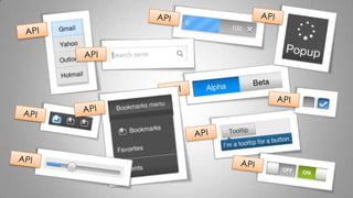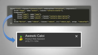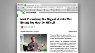 This document discusses how to build native-quality HTML5 apps using components. Components encapsulate markup, logic, state, and lifecycle management to create reusable UI elements like sliders, labels, and views. As apps are built from these components, they gain consistent look and feel, high performance, and other benefits like maintainability and reusability without reinventing the wheel. The document also explores how emerging web standards like HTML templates, custom elements, and Shadow DOM support building apps from reusable components.