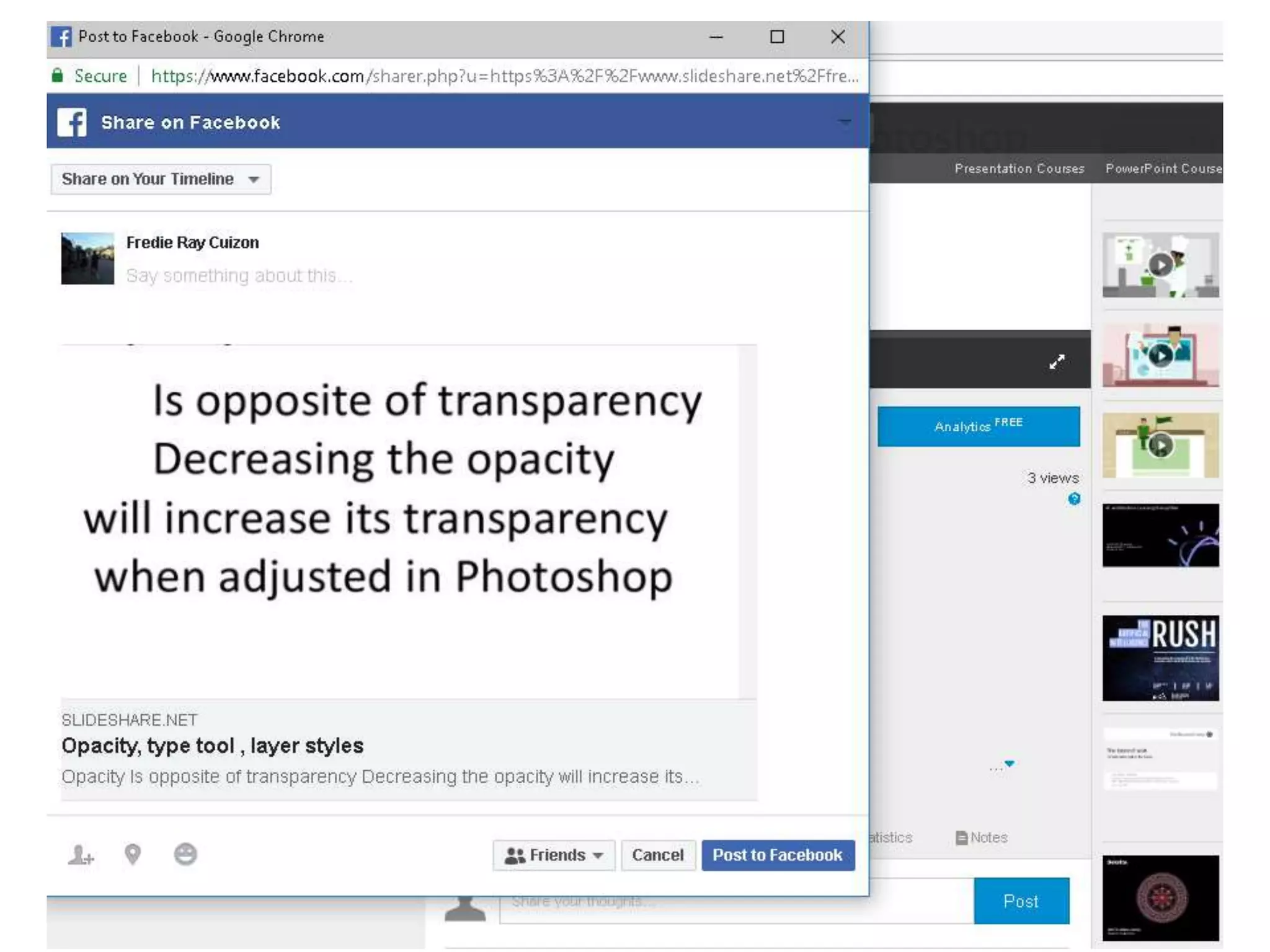 Slideshare is a website that allows users to upload and share presentations. Users can create a LinkedIn account to upload, view, comment on, and share presentations publicly or privately in formats like PowerPoint, PDF, and Keynote. To upload a presentation, users log into their account and select the "upload" button to choose a file from their computer. They add a title, tags, category, description, and set the privacy setting before publishing. Users can then share uploaded presentations by clicking the share button on the presentation page.