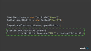 This document introduces the Vaadin framework, which is a user interface framework for building rich web applications. It discusses how Vaadin enables developer productivity through features like user interface components, automated communication between the client and server, and support for multiple devices. The document also covers trends in web frameworks like AngularJS and web components, and how Vaadin is exploring these trends through new components in Vaadin Labs and building web components with GWT.