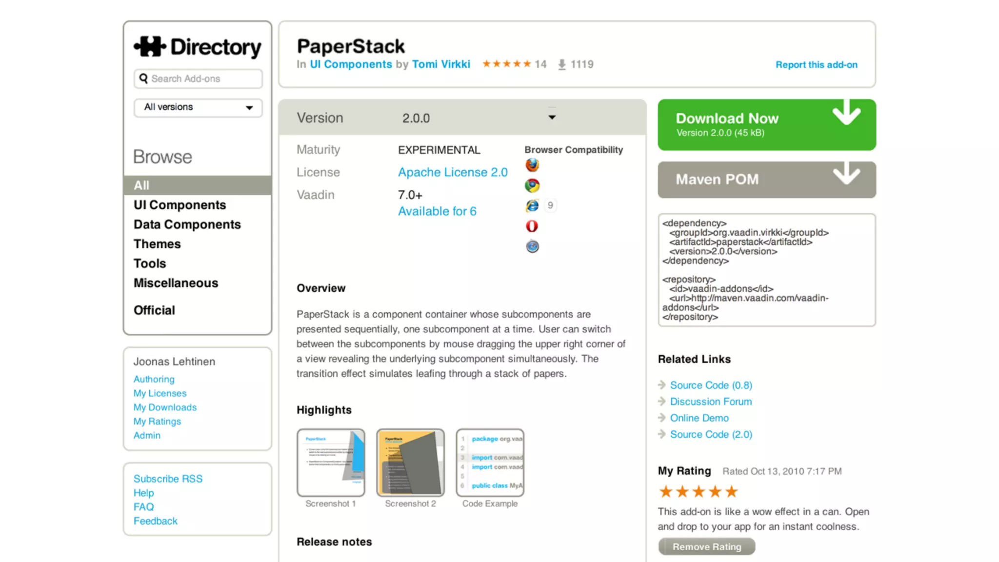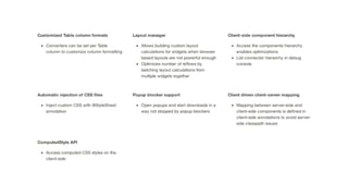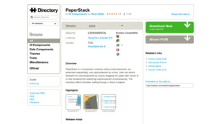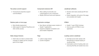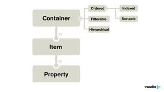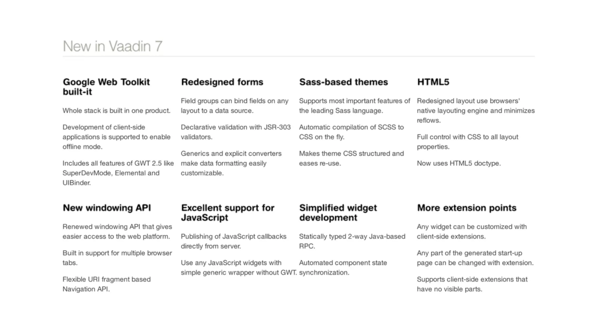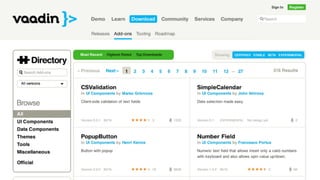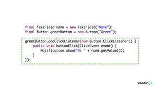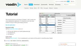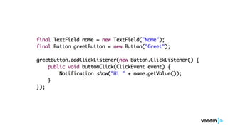 Vaadin 7 is a Java framework for building rich web applications. It allows developers to write UI code in Java and have it rendered as responsive HTML, CSS, and JavaScript that runs in any browser. Key features include rich UI components, separation of server and client code, and support for any JVM language and cloud platform. The framework embraces modern web standards and allows developers to build consumer-grade UX with a business system budget.