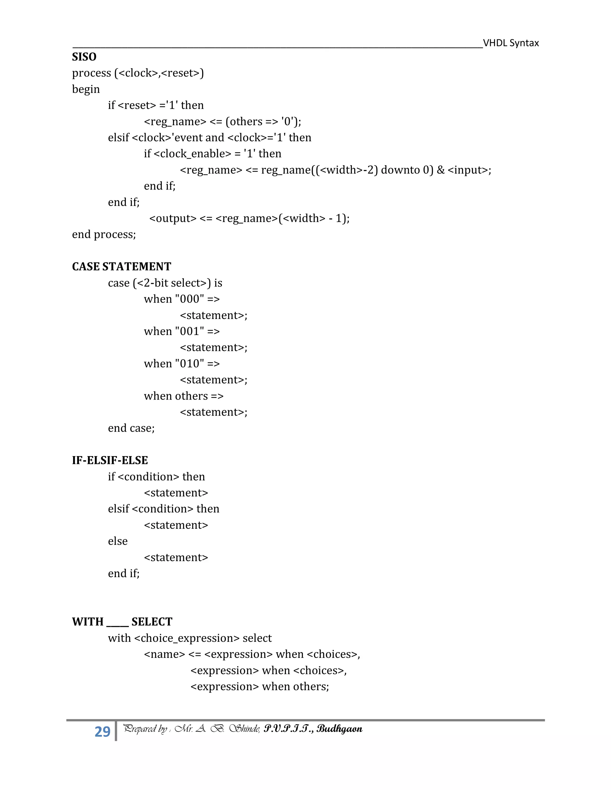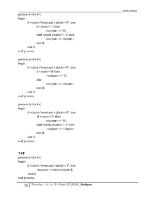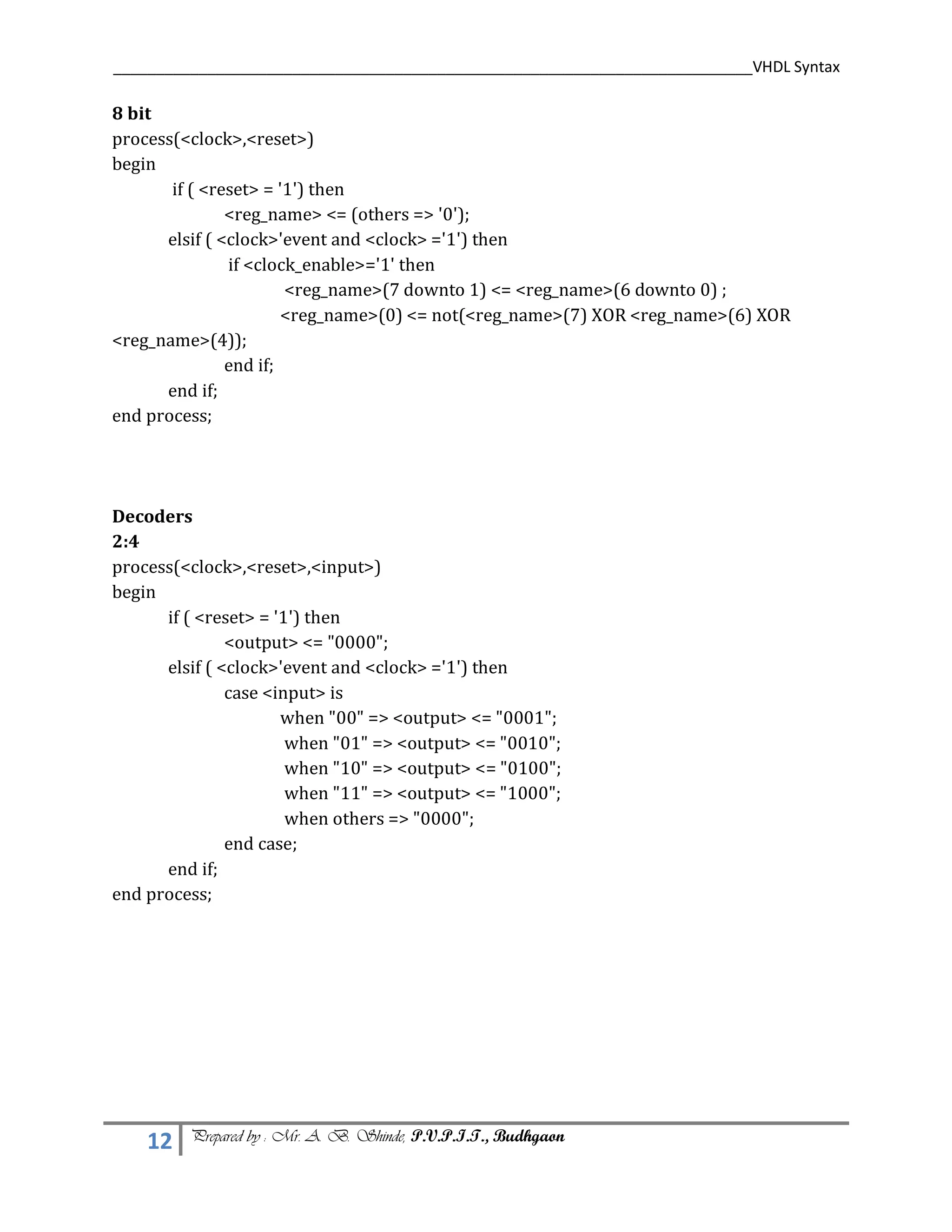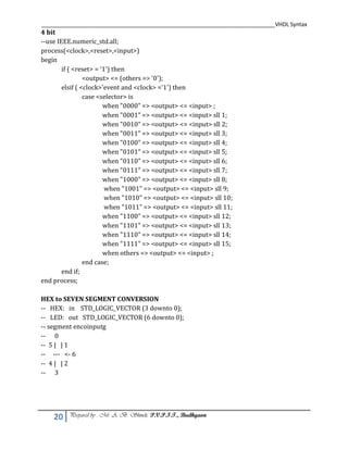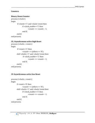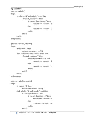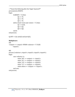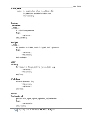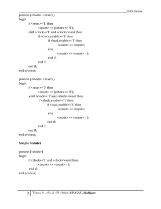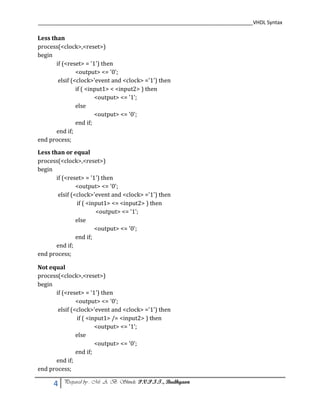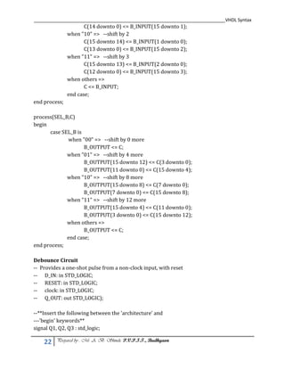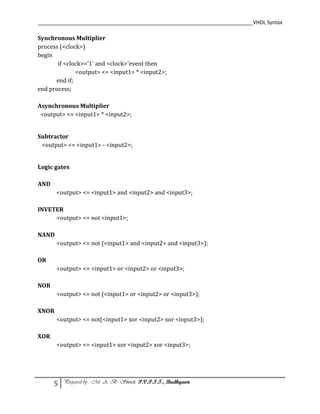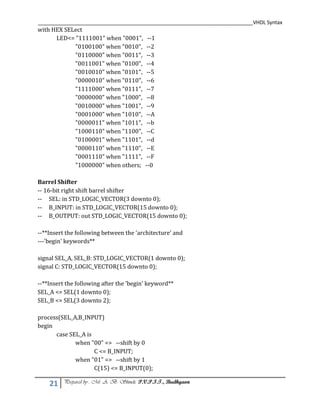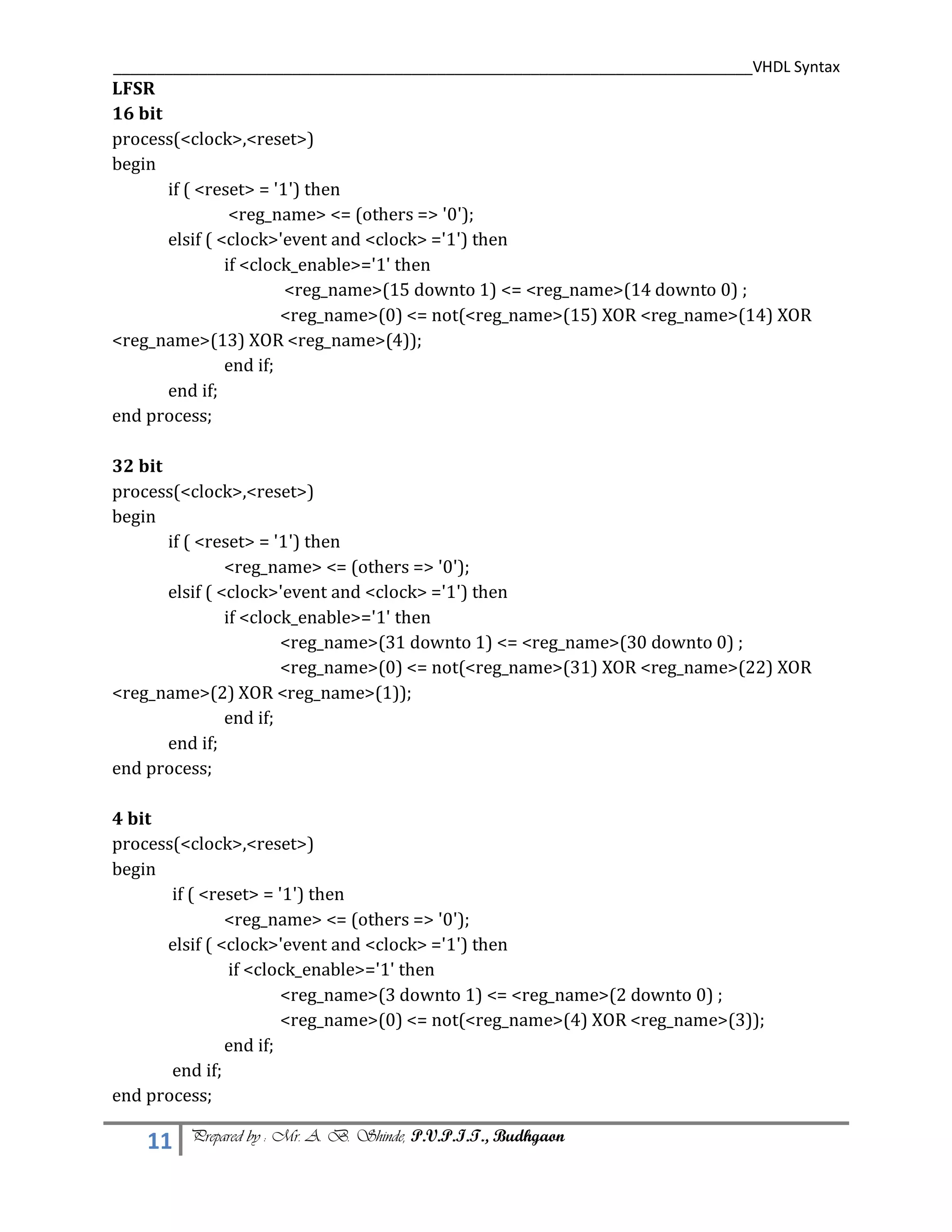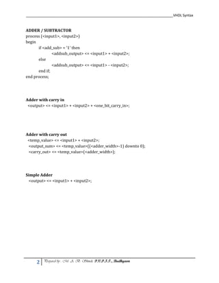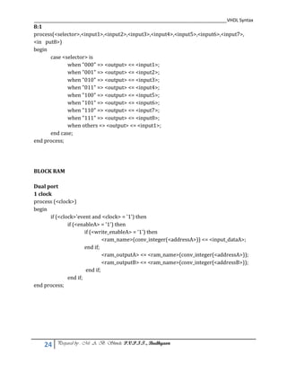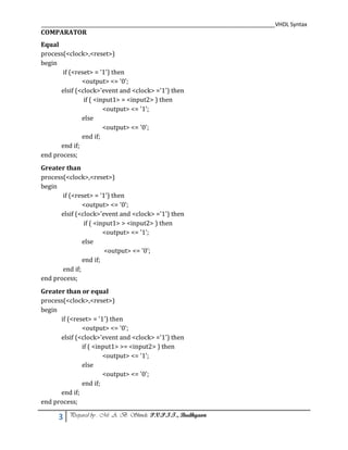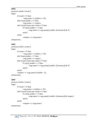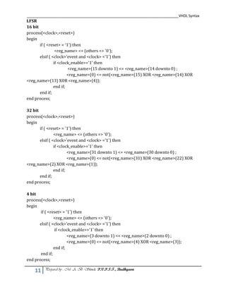 This document contains VHDL code examples for common digital logic components such as adders, comparators, counters, decoders, and linear feedback shift registers (LFSRs). It provides the VHDL syntax for implementing these components using processes, if/else statements, and case statements. The document is intended as a reference for a digital systems design lab manual. It was prepared by an instructor at Padmabhooshan Vasantraodada Patil Institute of Technology.