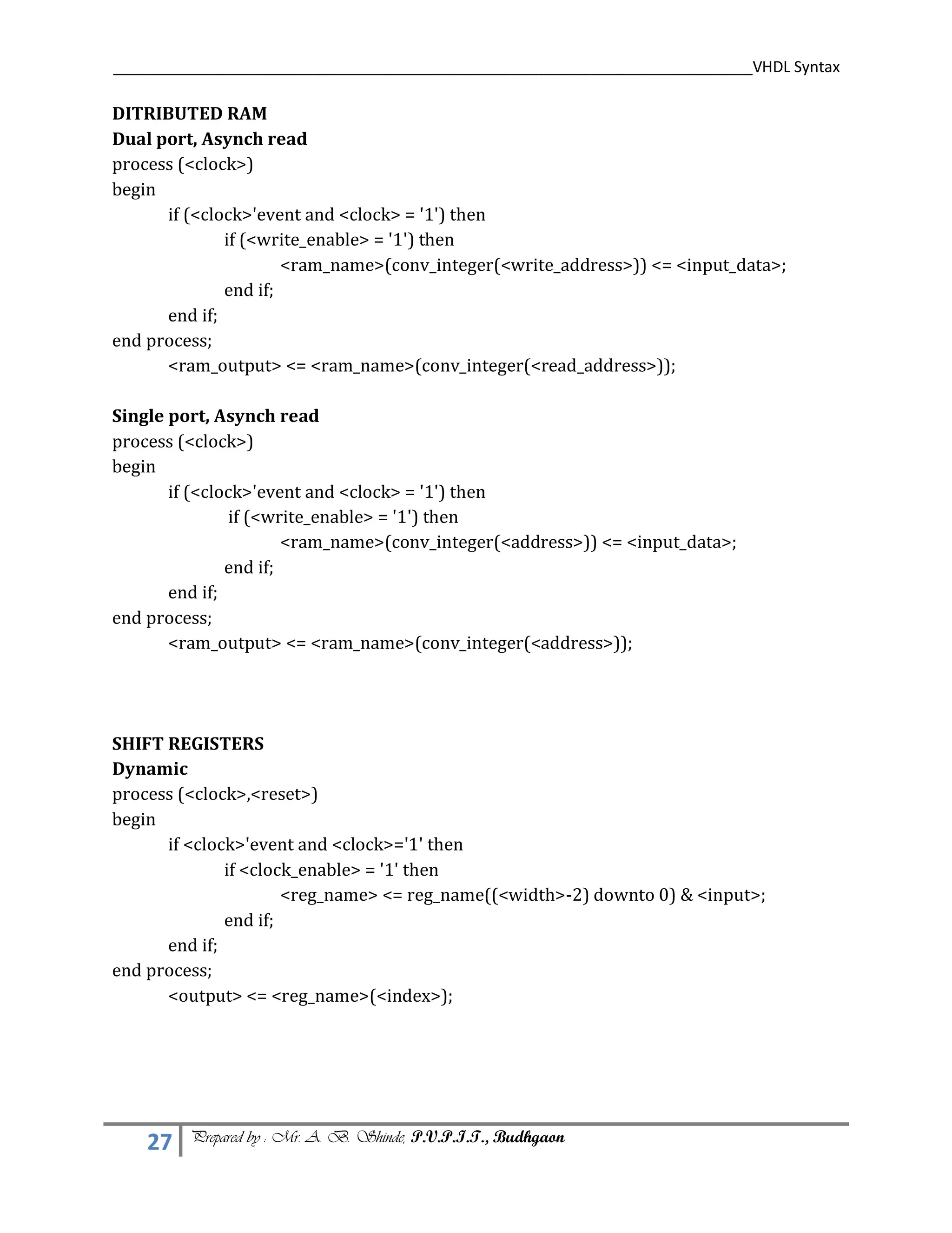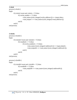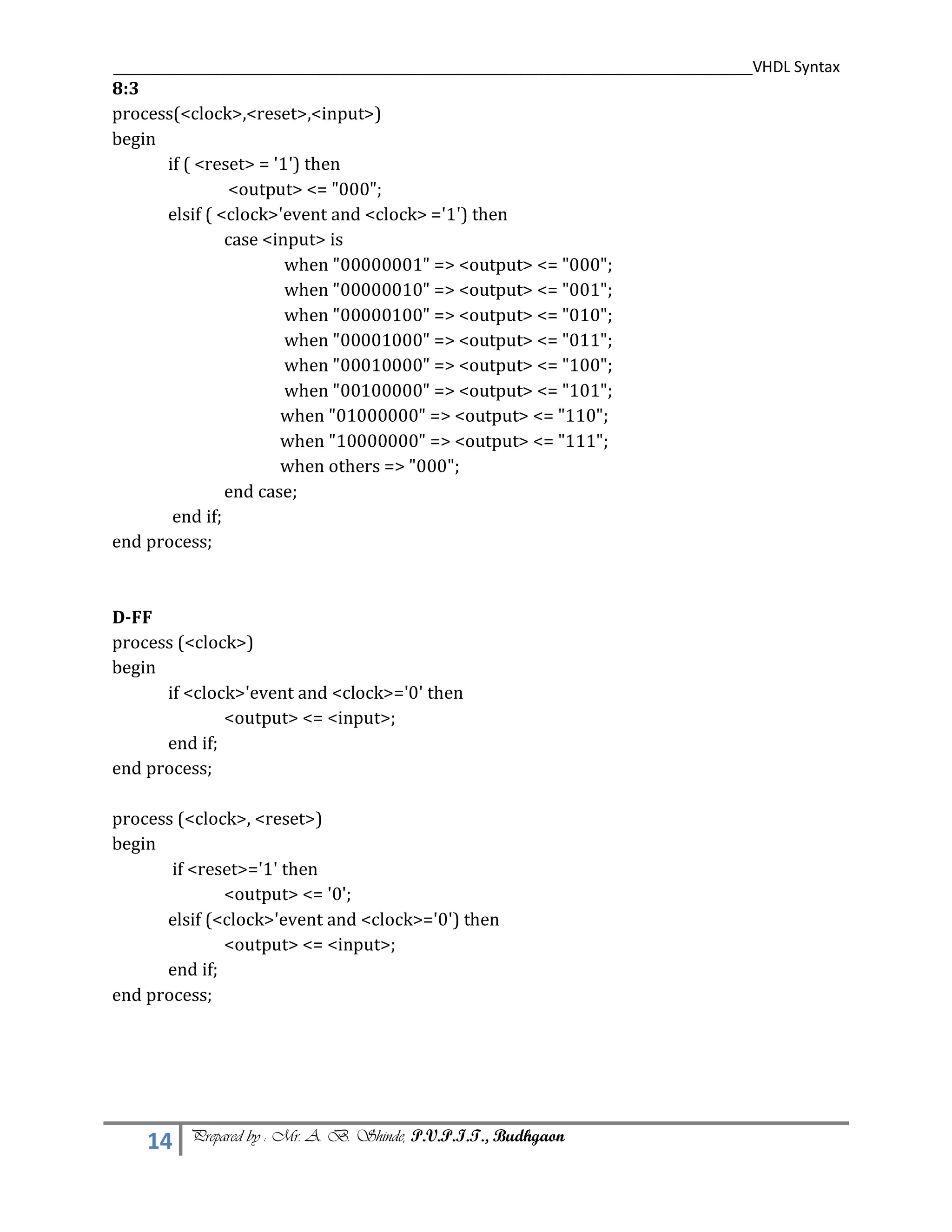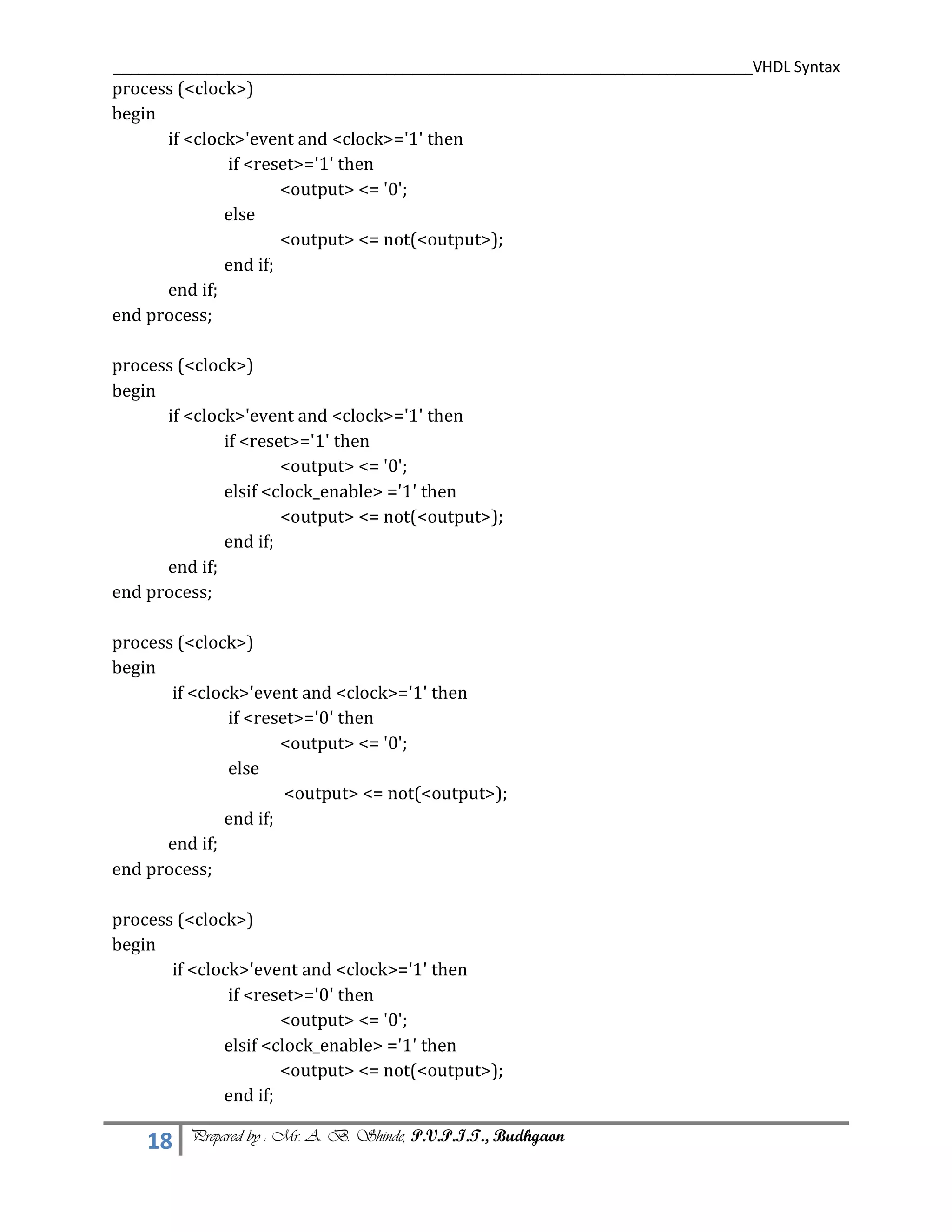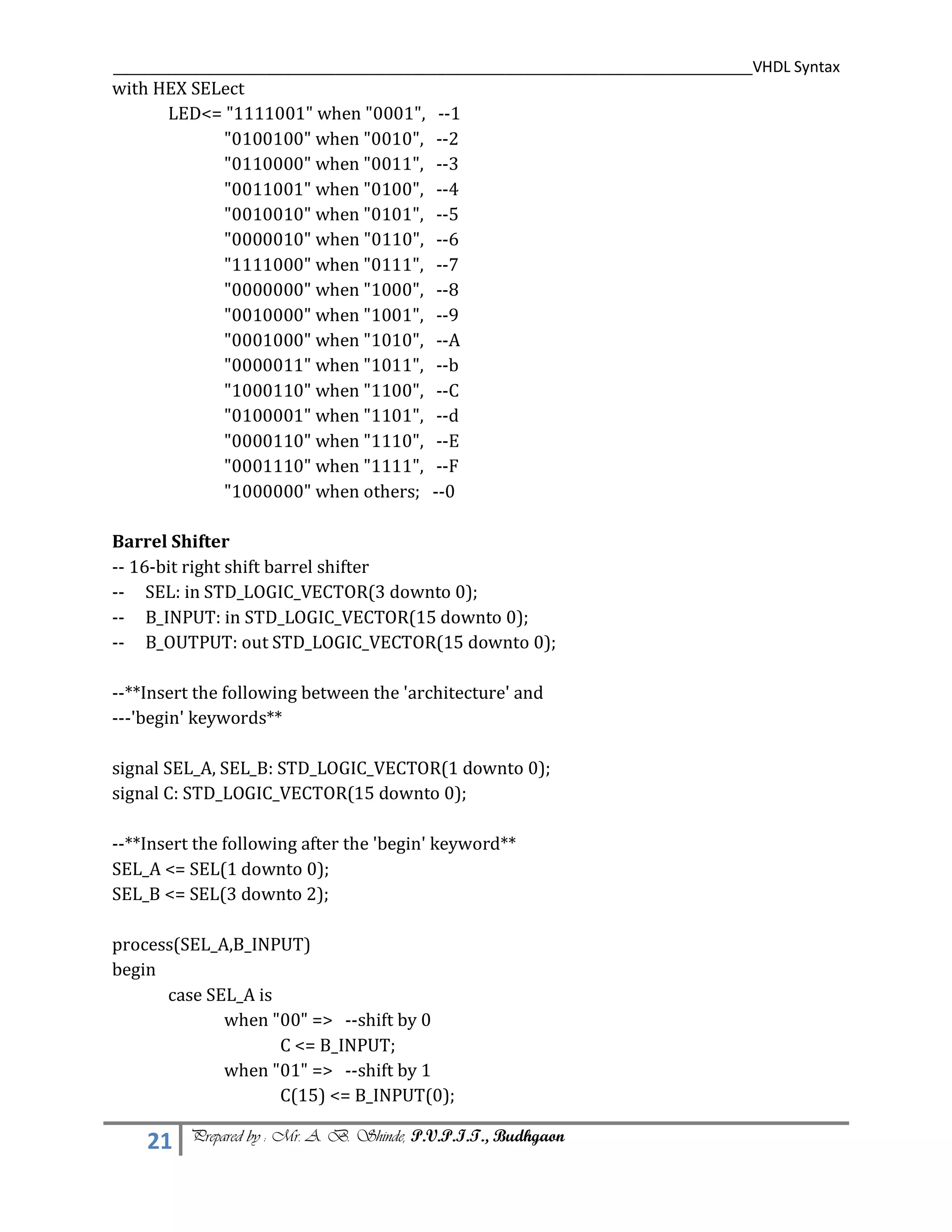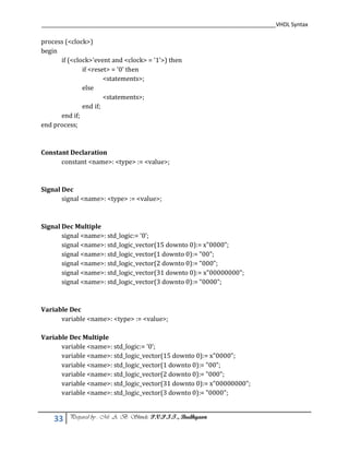 This document contains VHDL code examples for common digital logic components such as adders, comparators, counters, decoders, and linear feedback shift registers (LFSRs). It provides the VHDL syntax for implementing these components using processes, if/else statements, and case statements. The document is intended as a reference for a digital systems design lab manual. It was prepared by an instructor at Padmabhooshan Vasantraodada Patil Institute of Technology.