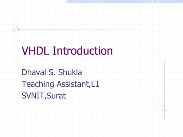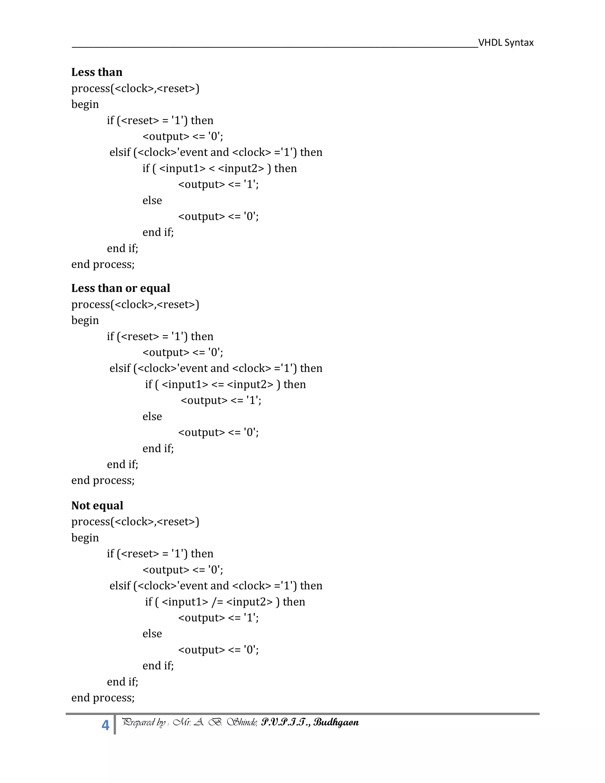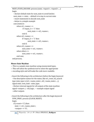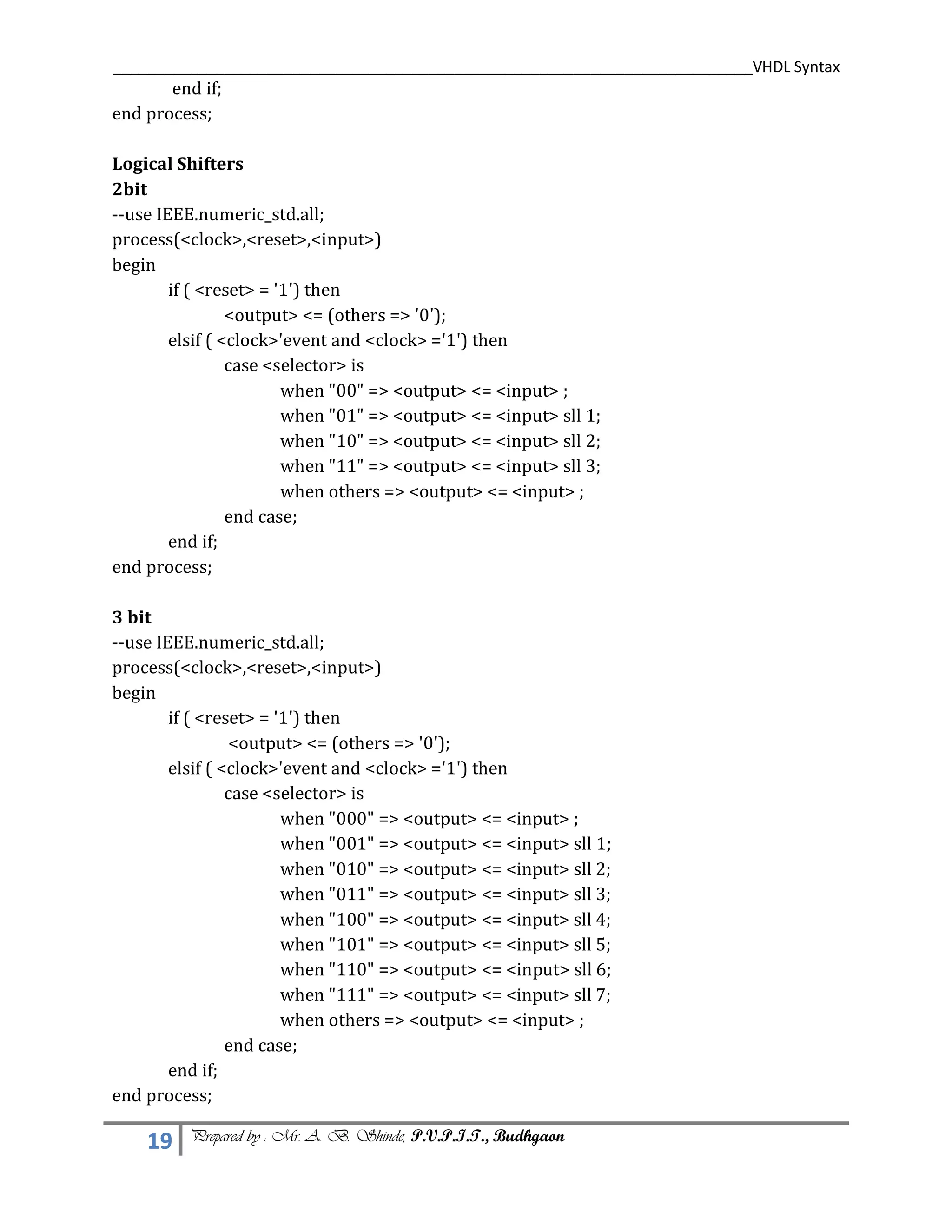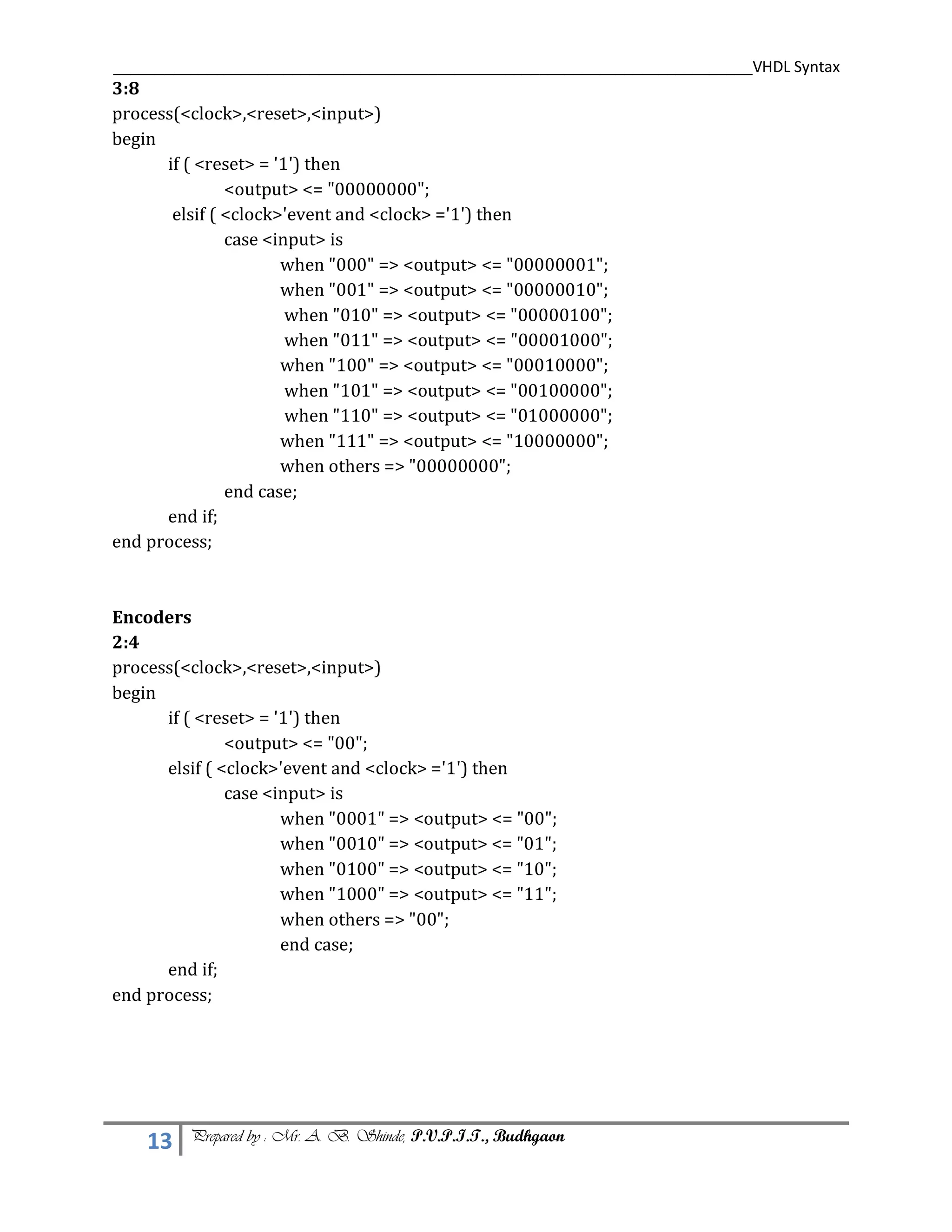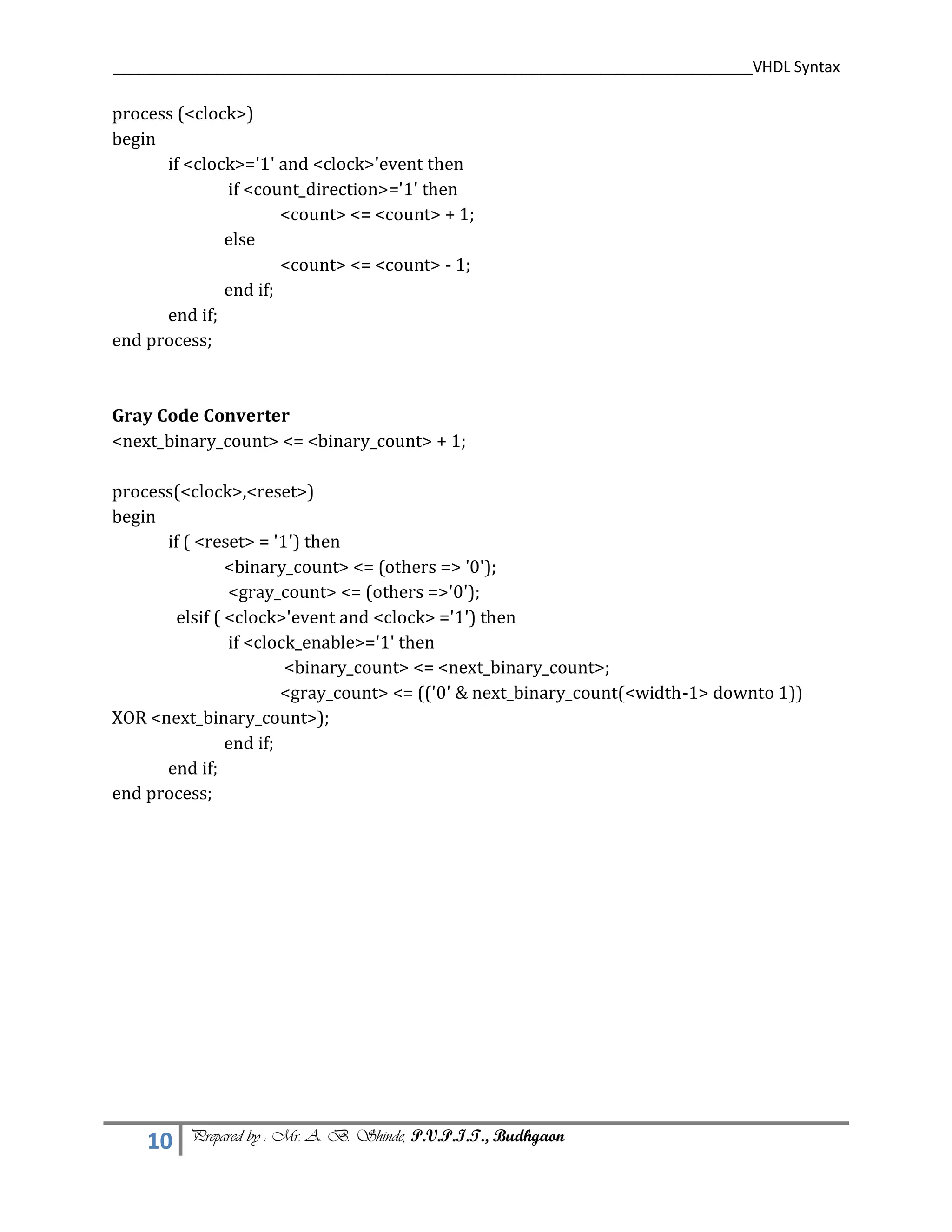 This document contains VHDL code examples for common digital logic components such as adders, comparators, counters, decoders, and linear feedback shift registers (LFSRs). It provides the VHDL syntax for implementing these components using processes, if/else statements, and case statements. The document is intended as a reference for a digital systems design lab manual. It was prepared by an instructor at Padmabhooshan Vasantraodada Patil Institute of Technology.