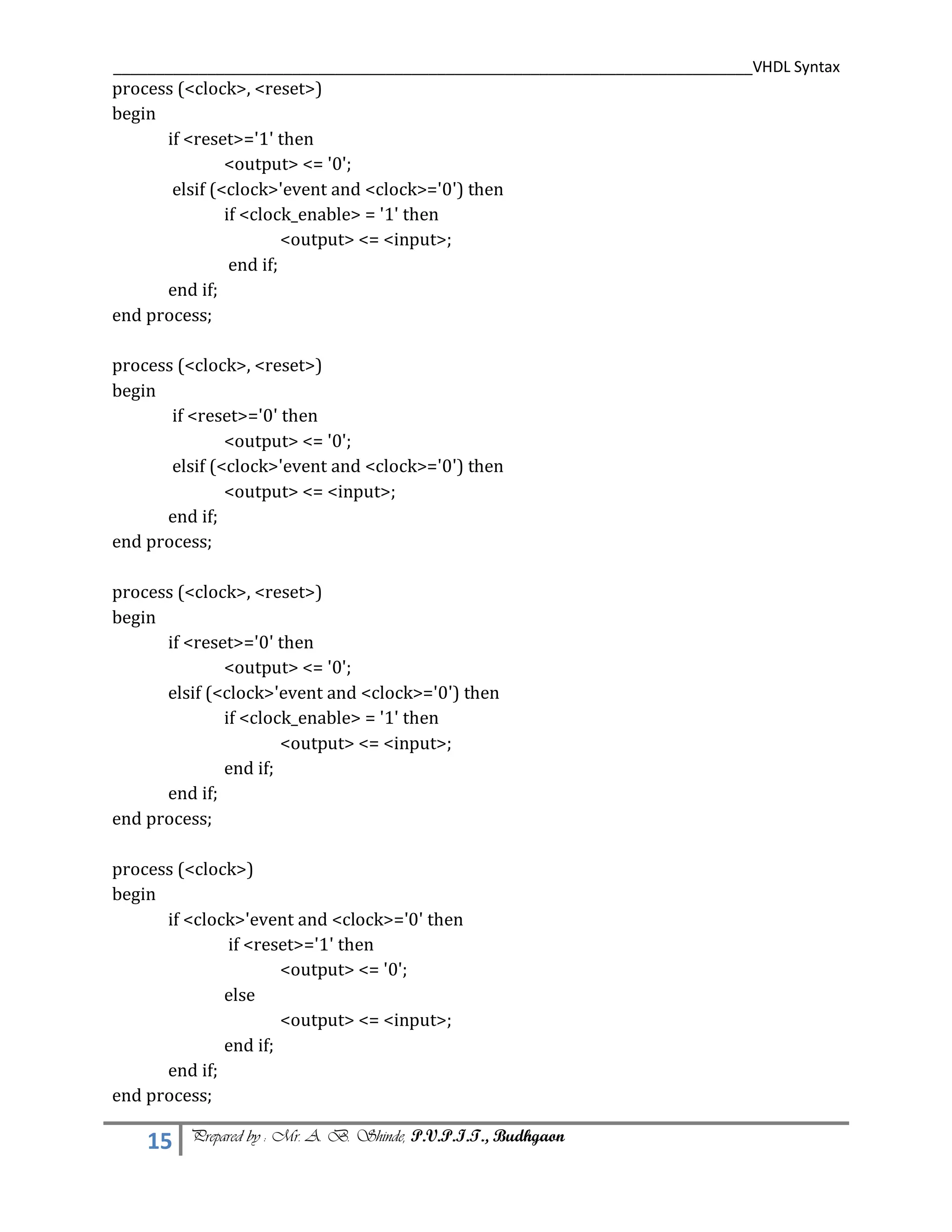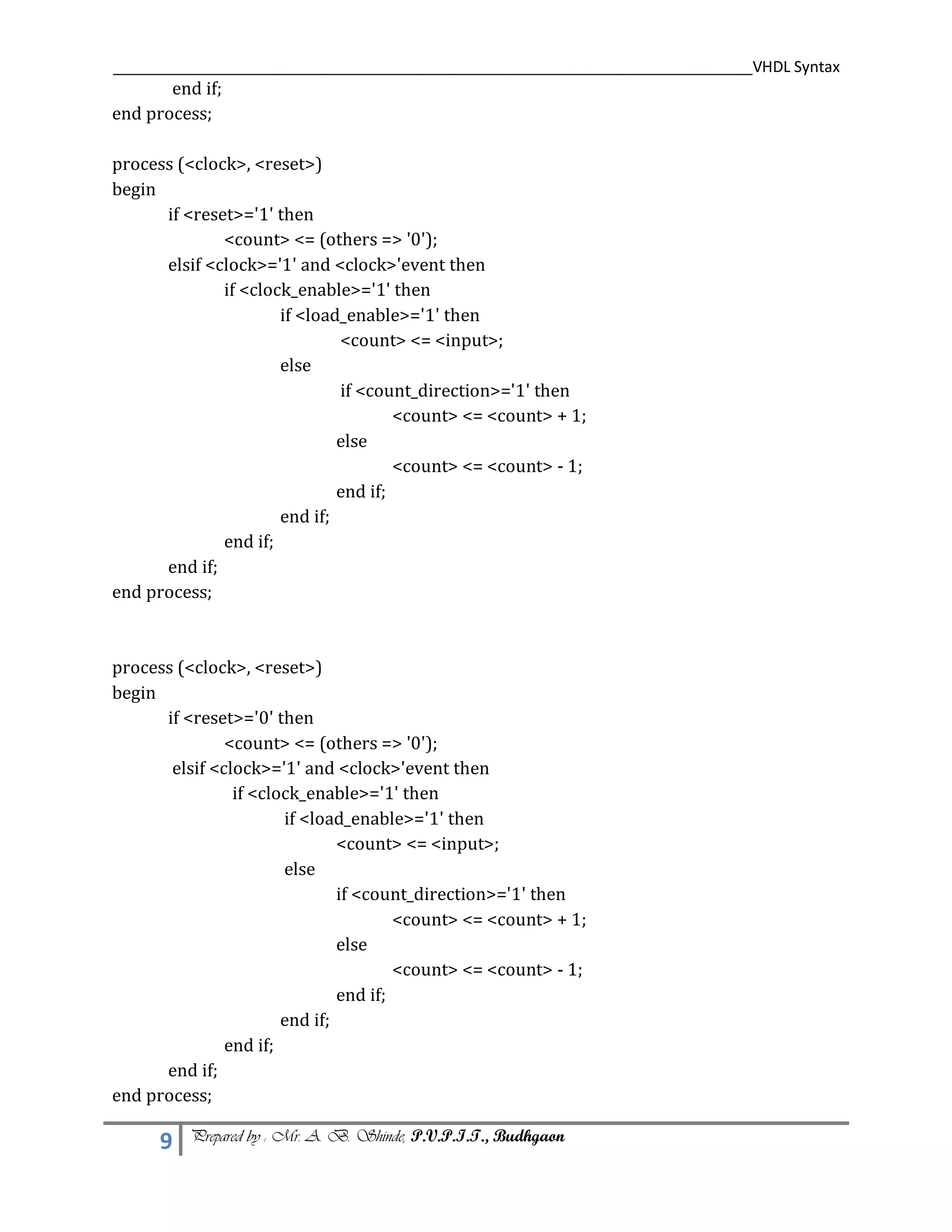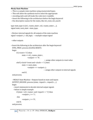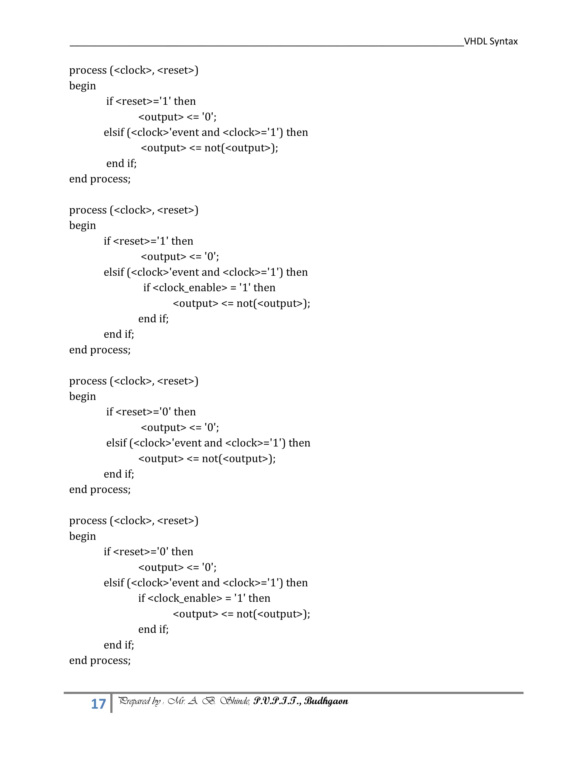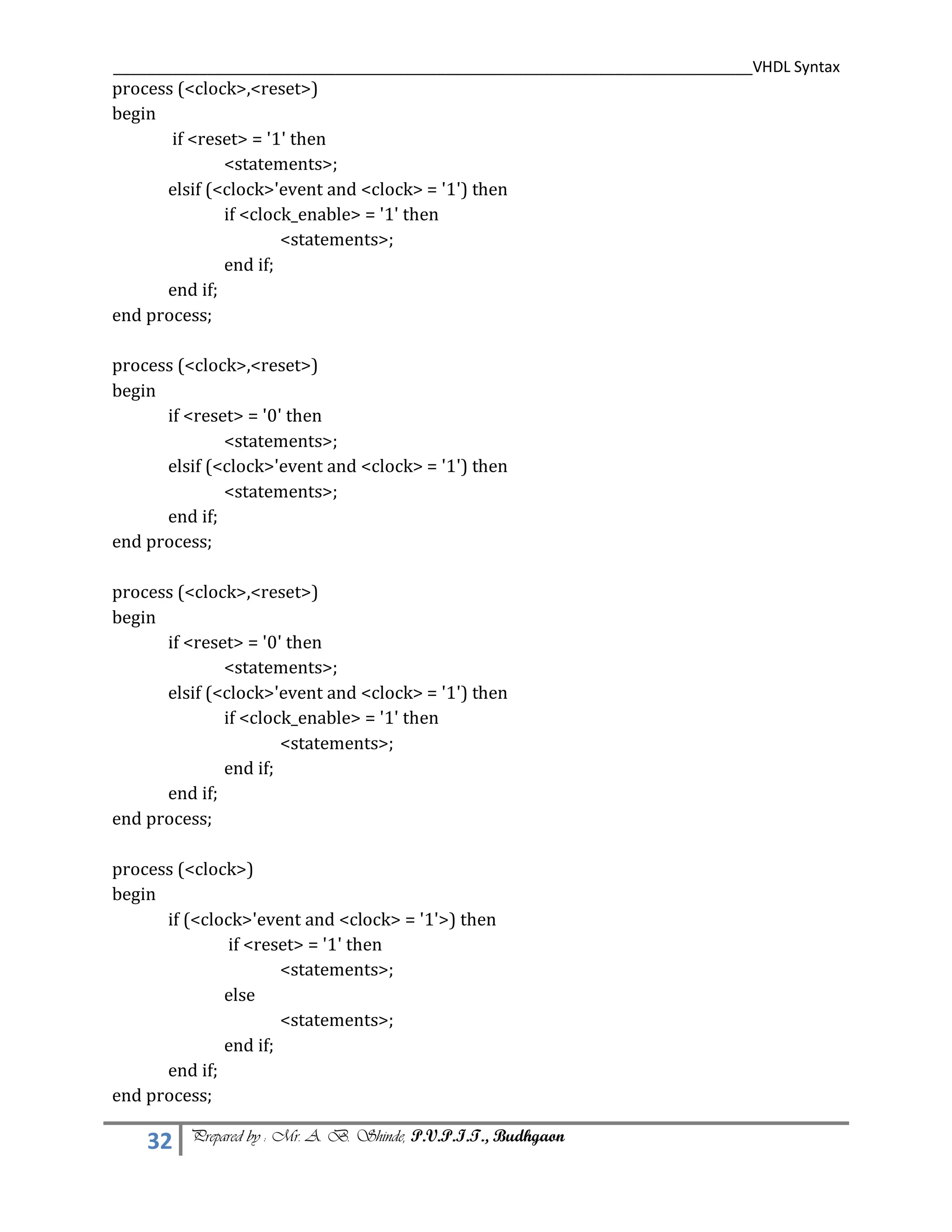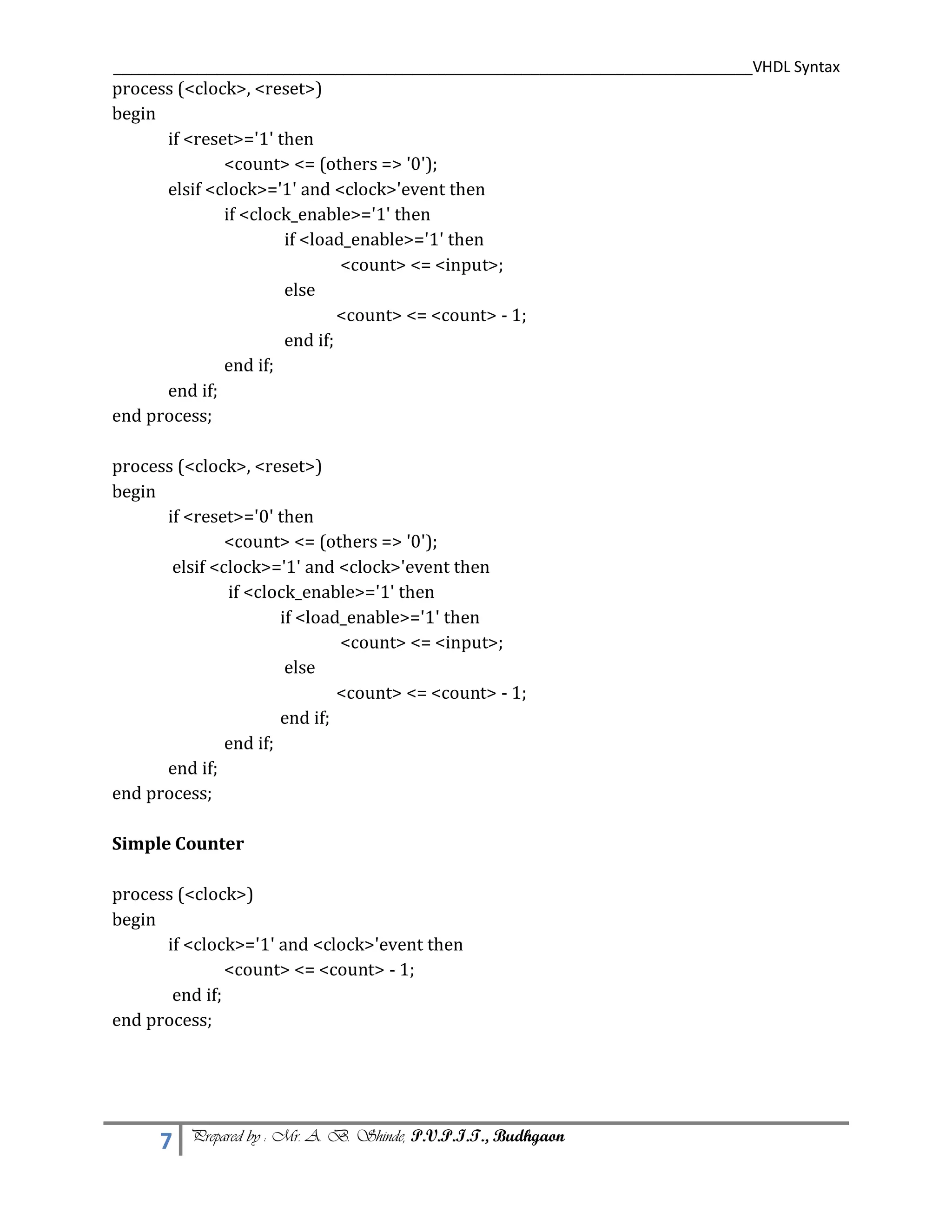 This document contains VHDL code examples for common digital logic components such as adders, comparators, counters, decoders, and linear feedback shift registers (LFSRs). It provides the VHDL syntax for implementing these components using processes, if/else statements, and case statements. The document is intended as a reference for a digital systems design lab manual. It was prepared by an instructor at Padmabhooshan Vasantraodada Patil Institute of Technology.
