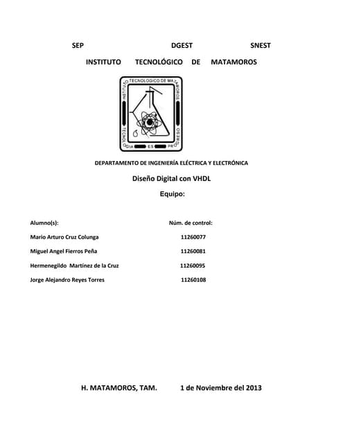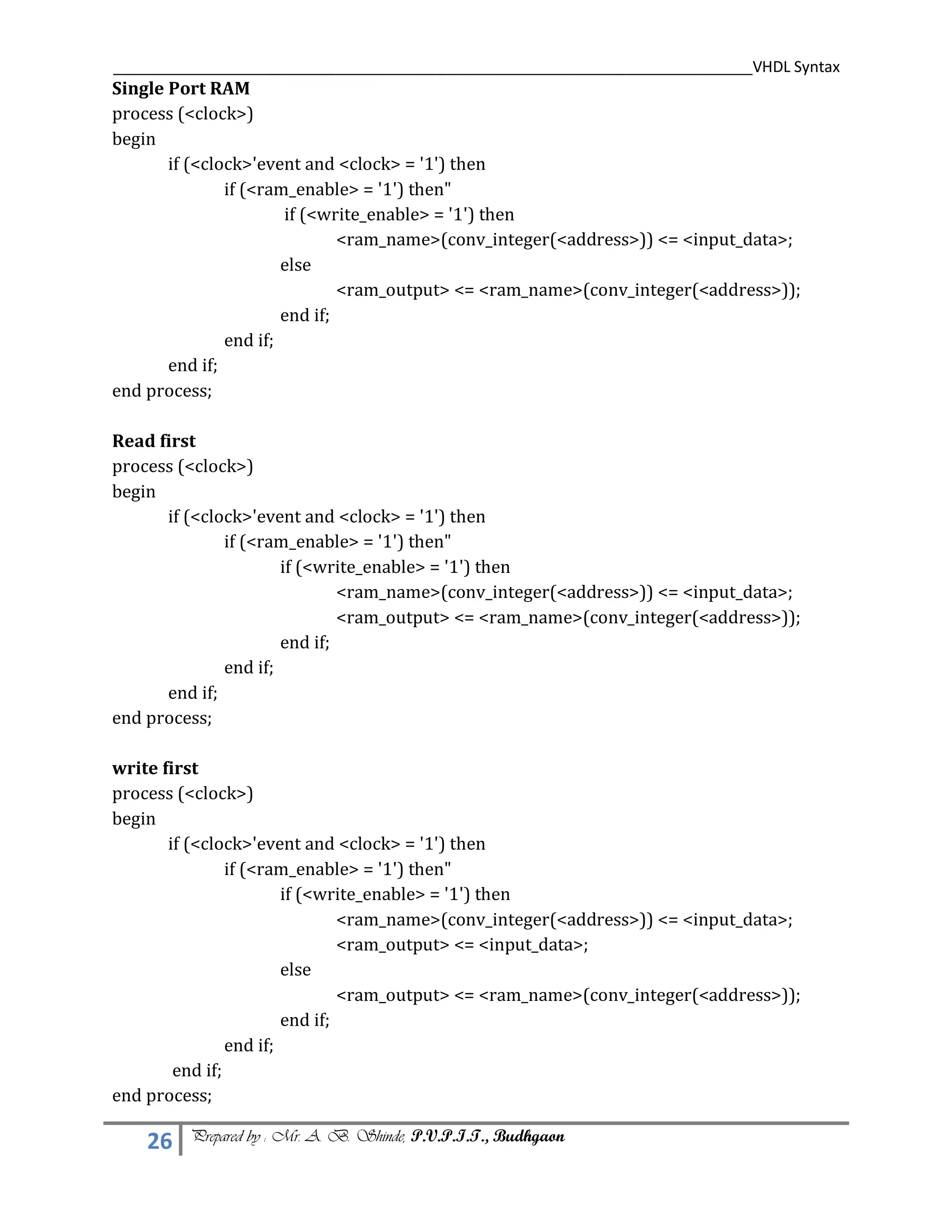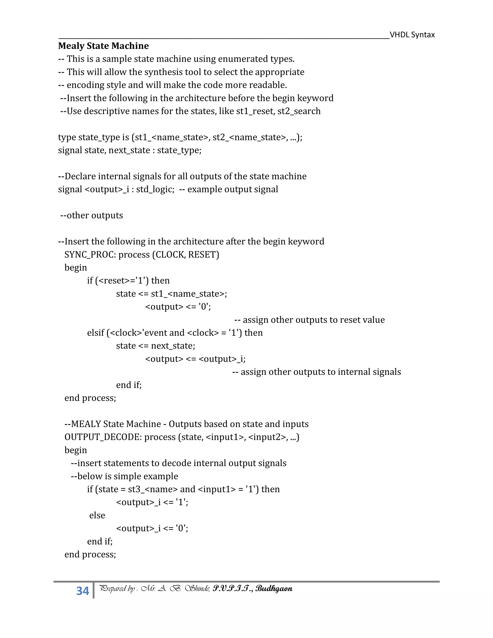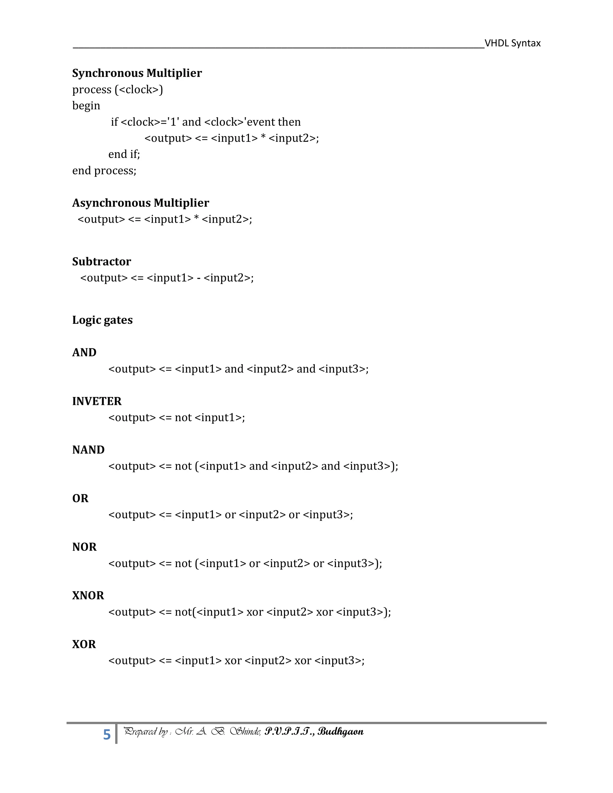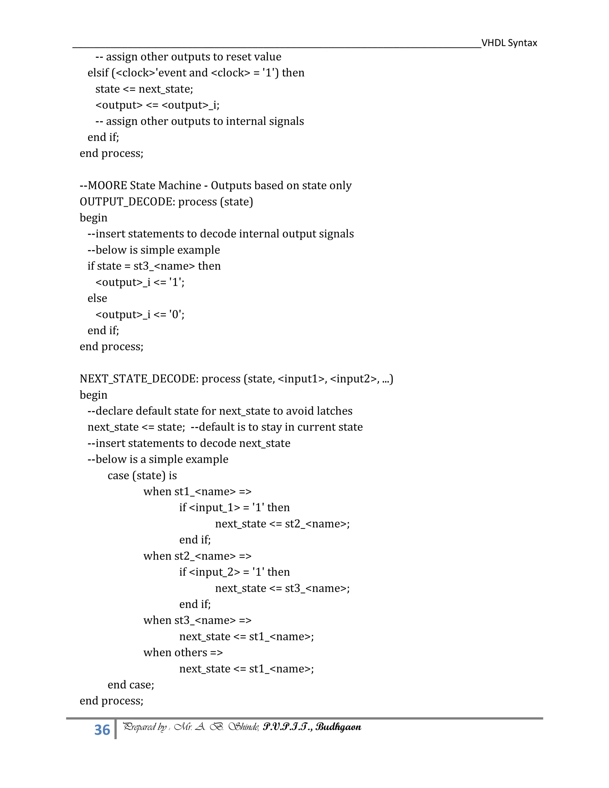 This document contains VHDL code examples for common digital logic components such as adders, comparators, counters, decoders, and linear feedback shift registers (LFSRs). It provides the VHDL syntax for implementing these components using processes, if/else statements, and case statements. The document is intended as a reference for a digital systems design lab manual. It was prepared by an instructor at Padmabhooshan Vasantraodada Patil Institute of Technology.