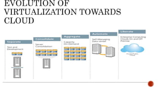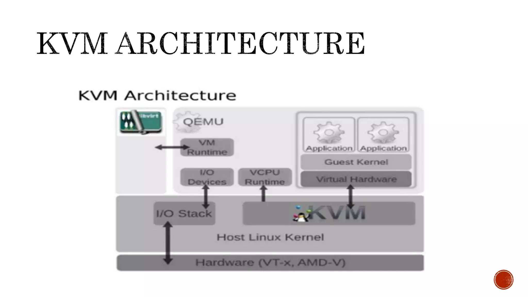 The document provides an overview of virtualization concepts, focusing on hypervisors and their types, particularly Type-1 and Type-2, as well as virtualization tools like KVM and QEMU. It highlights the benefits of virtualization, such as server consolidation and improved management, alongside its drawbacks, including performance hits and single points of failure. Additionally, it explains how KVM utilizes Linux kernel features to facilitate virtualization while allowing guests to run as regular processes.