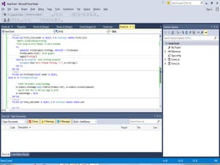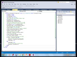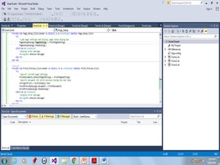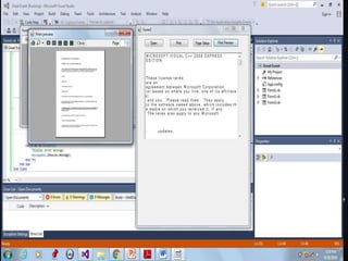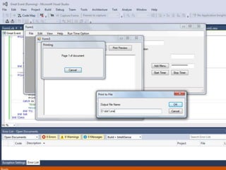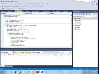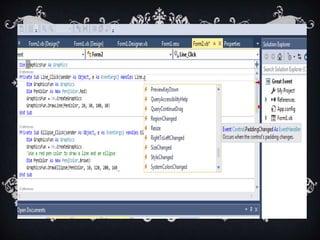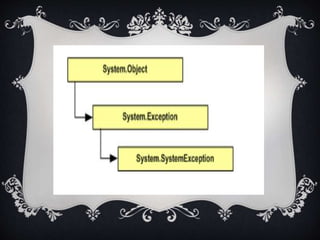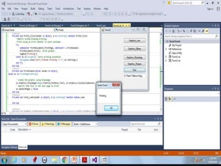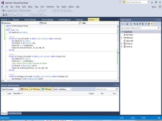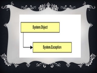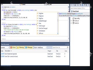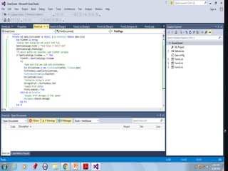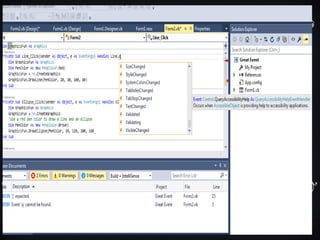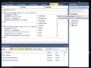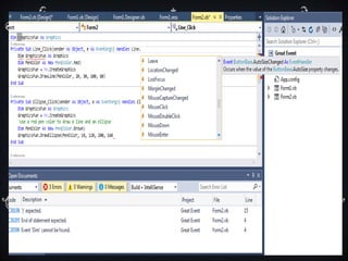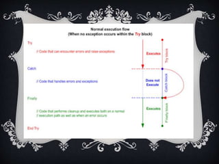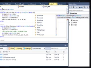 Interfaces allow for multiple inheritance in .NET and contain only method and property definitions without implementations. They are declared using the Interface keyword and implemented using the Implements keyword. Abstract classes can contain implemented members while interfaces cannot. Interfaces are useful when different objects need to share common behaviors. Events allow objects to notify other objects of actions through messages. They are handled by subscribing event handler methods. Exceptions disrupt normal program execution and are handled using try, catch, and finally blocks.