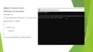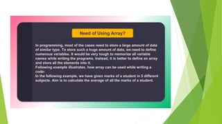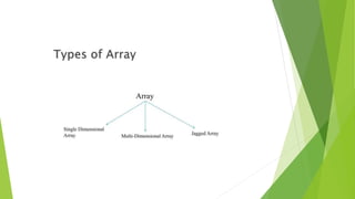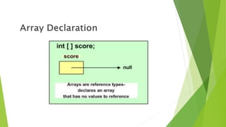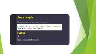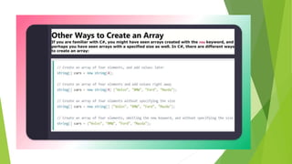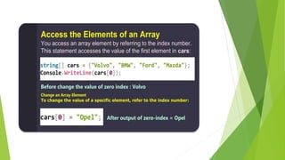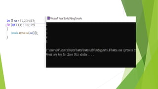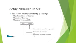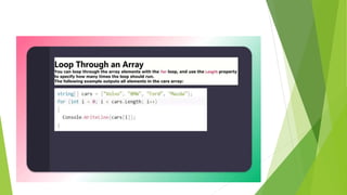 This document provides an overview of various looping constructs in C#, including while loops, do/while loops, for loops, and foreach loops, along with their syntax and uses. It also discusses nested loops, array handling, and introduces basic programming tasks such as calculating sums and generating patterns. Additionally, it covers array types, including single-dimensional, multi-dimensional, and jagged arrays, and demonstrates array sorting and common array functions.