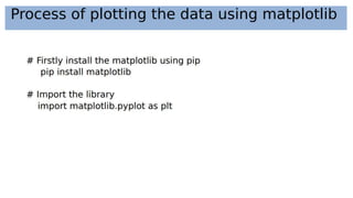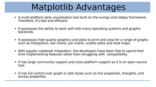 This document provides an overview of Matplotlib, a Python data visualization library. It discusses Matplotlib's pyplot and OO APIs, how to install Matplotlib, create basic plots using functions like plot(), and customize plots using markers and line styles. It also covers displaying plots, the Matplotlib user interface, Matplotlib's relationships with NumPy and Pandas, and examples of different types of graphs and charts like line plots that can be created with Matplotlib.