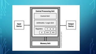 The von Neumann architecture, introduced by John von Neumann in 1945, describes a computer design that includes a control unit, arithmetic and logic unit, memory unit, registers, and input/output components, following the stored-program concept. In this architecture, data and instructions are stored in the same memory, and key components include registers for fast data storage and various buses for communication between the CPU, memory, and peripherals. This foundational design remains prevalent in modern computing systems.