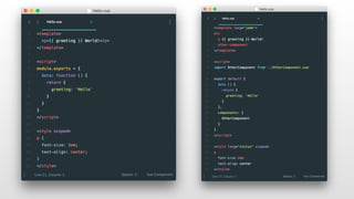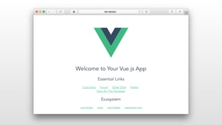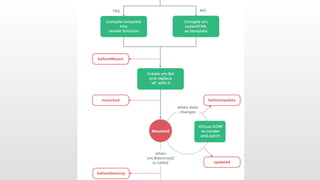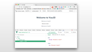Vue.JS is a progressive JavaScript framework created by Evan You, formerly of Google. It was first released in 2014 and is growing in popularity as an alternative to AngularJS and React. Key features include declarative rendering, dependency tracking for automatic re-renders, and directives for DOM manipulation. Developers can get started by adding Vue to an HTML page or with single file components using tools like Webpack. The documentation provides many examples for building interfaces with directives, conditional rendering, forms, and more. While still smaller than communities for Angular and React, Vue has growing support from companies and an active ecosystem of libraries.