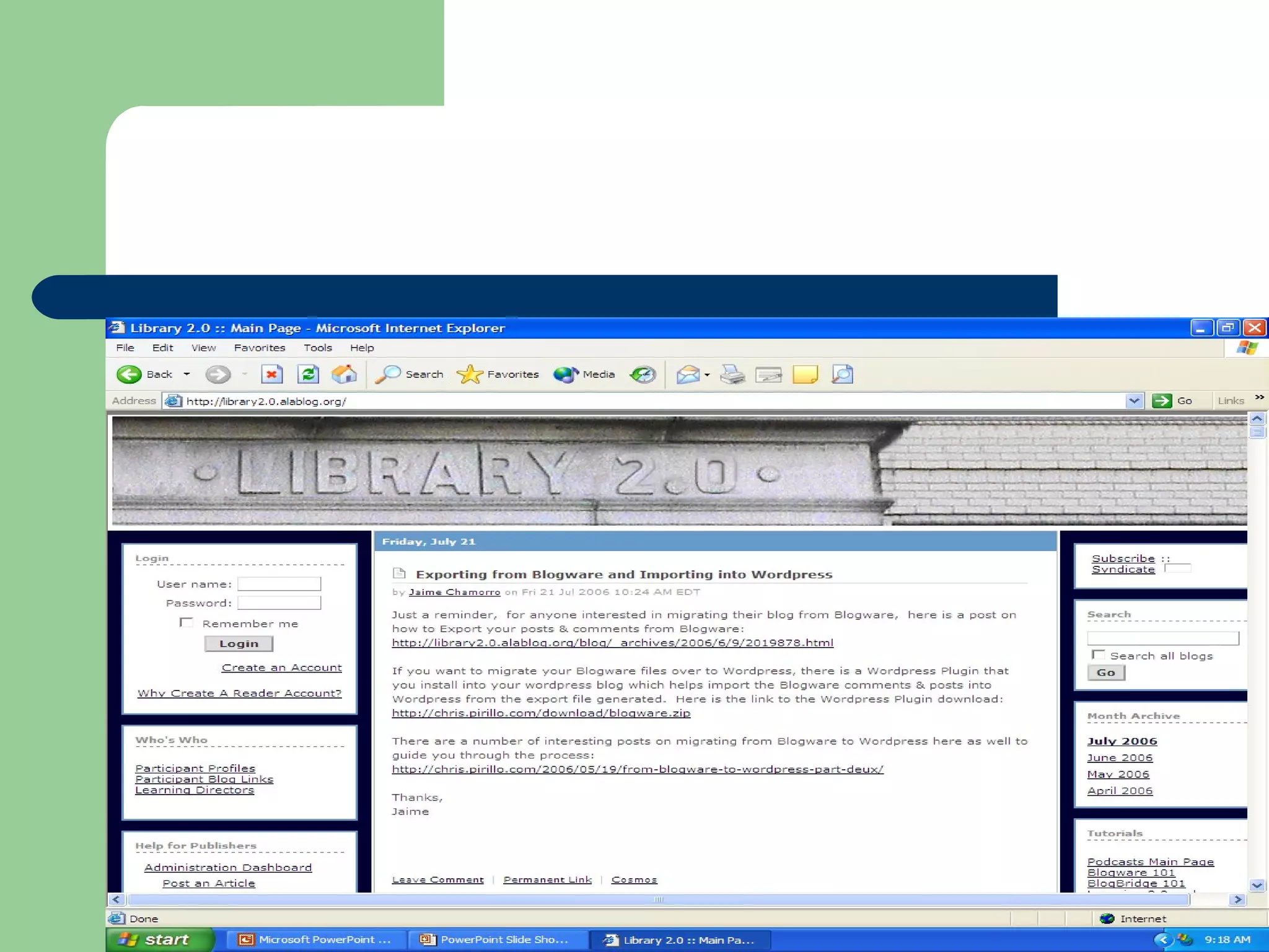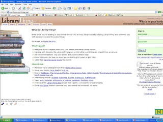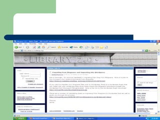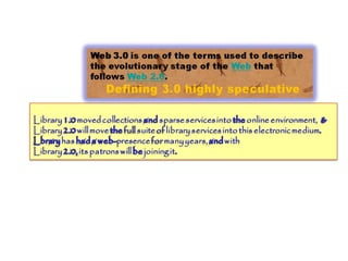 The document discusses the implications of Web 2.0 technologies on library services, defining 'Library 2.0' as an application of these technologies in the library context to enhance user participation and engagement. It explores various Web 2.0 tools, like social media and collaborative platforms, and their potential transformative effects on how libraries interact with their users. The document emphasizes the importance of creating user-centered, participative library services that adapt to changing user needs and expectations.