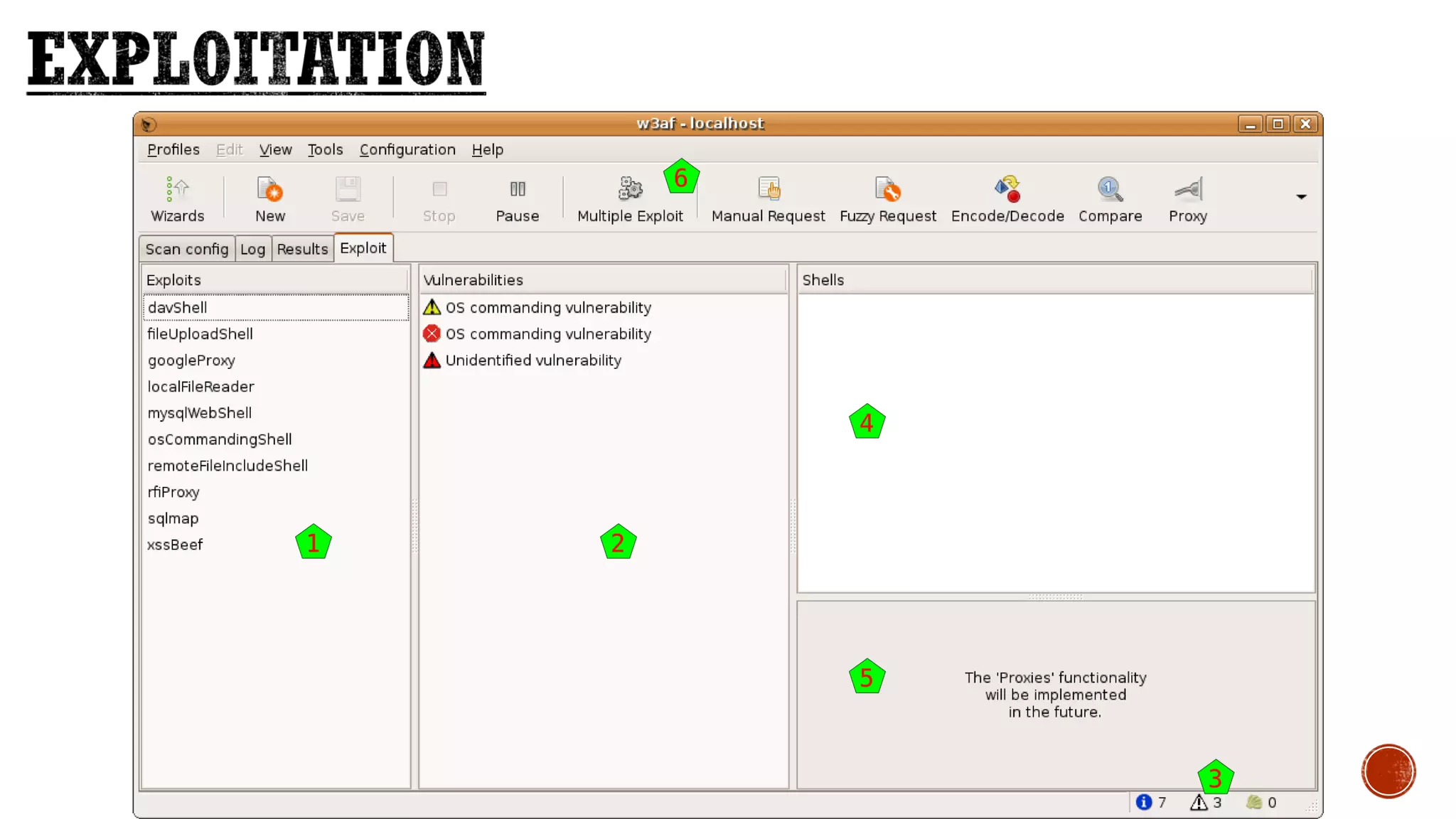 At the right part of the window, there’re two panels: one [4] for the exploited