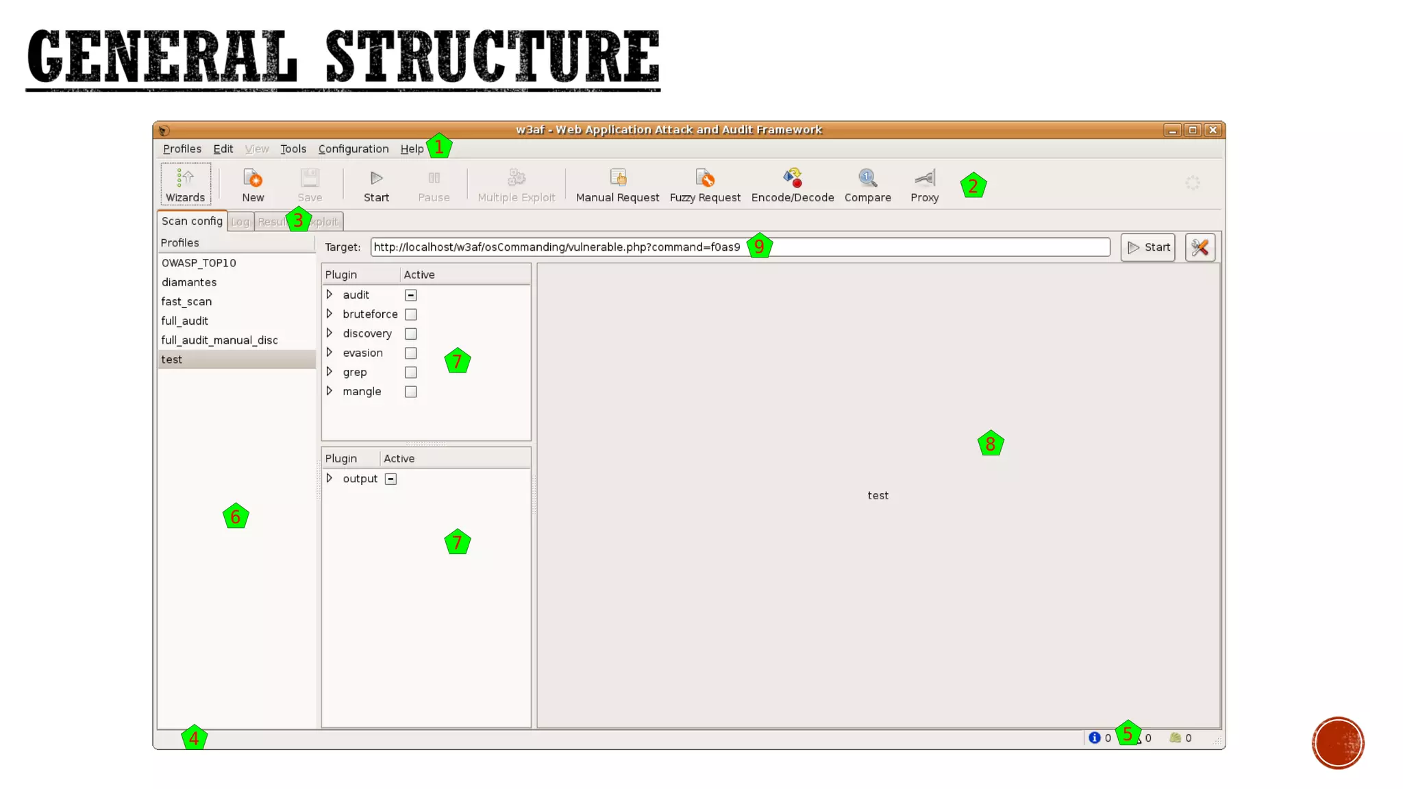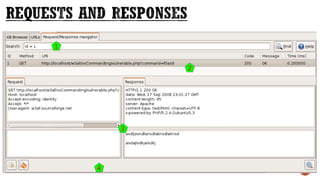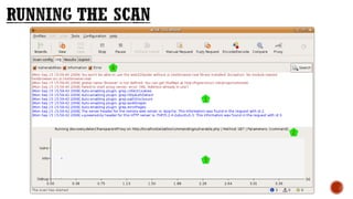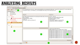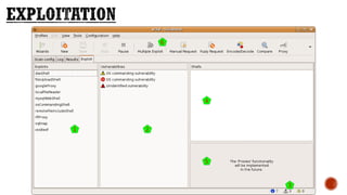 The document discusses w3af, an open-source web application security scanner that identifies vulnerabilities such as SQL injections, XSS, and more, aiding penetration testing. It outlines the tool's features including a user interface, plugin configurations, and a logging system for monitoring scan progress and results. Additionally, it explains how to exploit detected vulnerabilities using the tool's interface, which includes options for manual and batch exploitation of vulnerabilities.