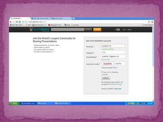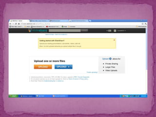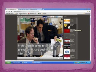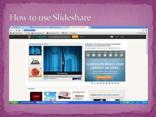 SlideShare is a website for sharing presentations, documents, videos and webinars. It is the world's largest community for sharing presentations. Users can upload content publicly or privately and embed or share it on other websites and social media. SlideShare supports various file types and formats presentations with audio, and allows users to find and reuse content on any topic. The White House and other government departments regularly use SlideShare.