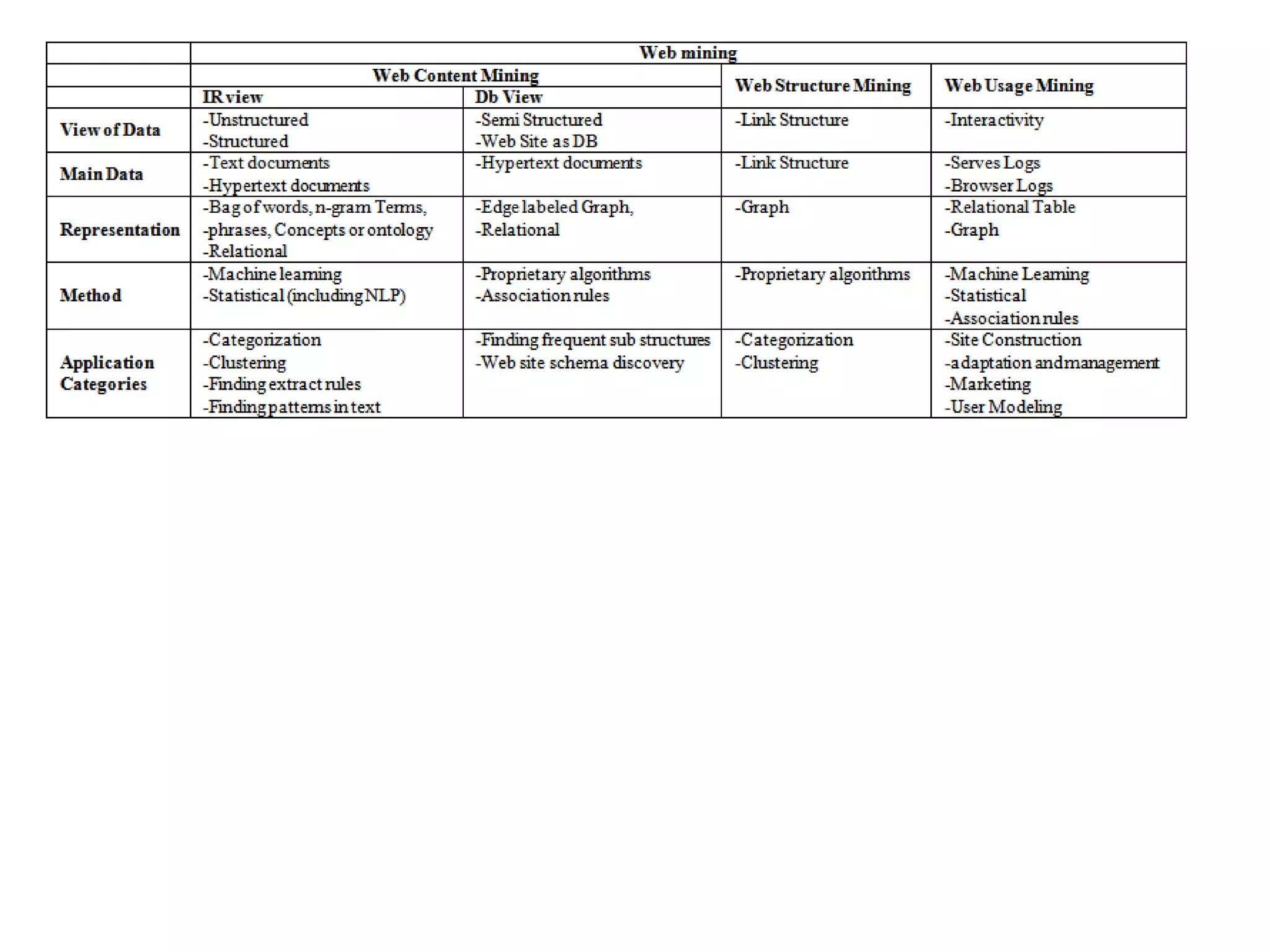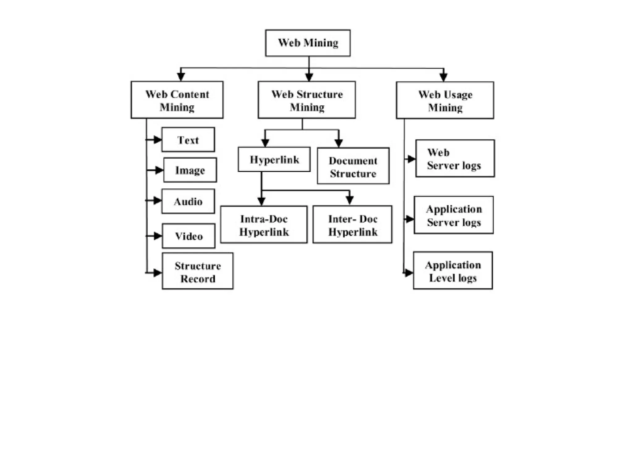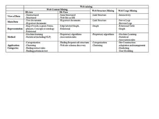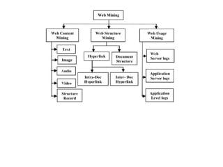 Web mining encompasses the use of data mining techniques to discover and extract valuable information from the vast and dynamic content of the World Wide Web. It addresses problems such as finding relevant information, creating new knowledge, personalizing content, and understanding user behavior, utilizing various methodologies including content, structure, and usage mining. Furthermore, web mining intersects with fields like information retrieval and machine learning to improve data extraction and user interaction on the web.