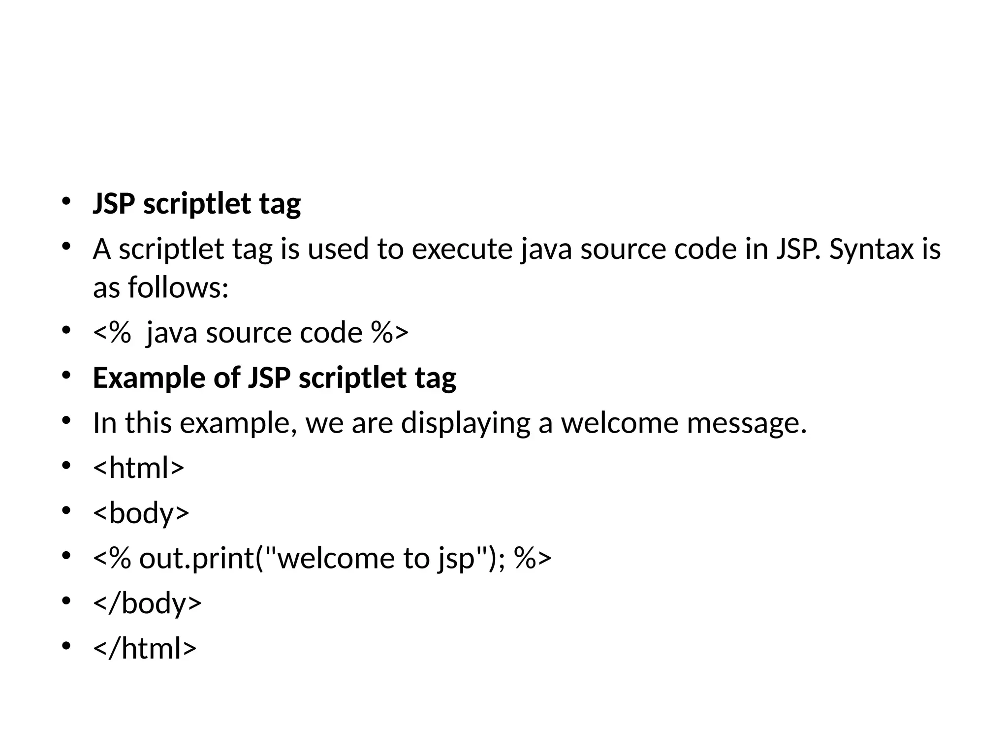 • A scriptlet tag is used to execute java source code in JSP. Syntax is