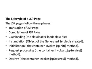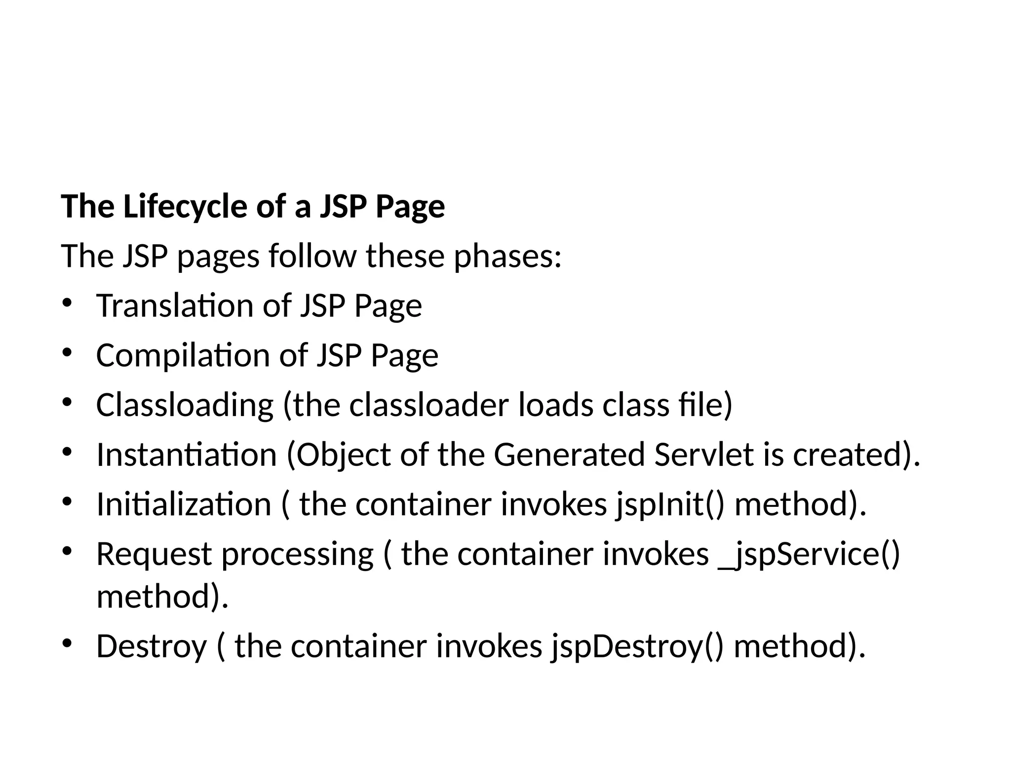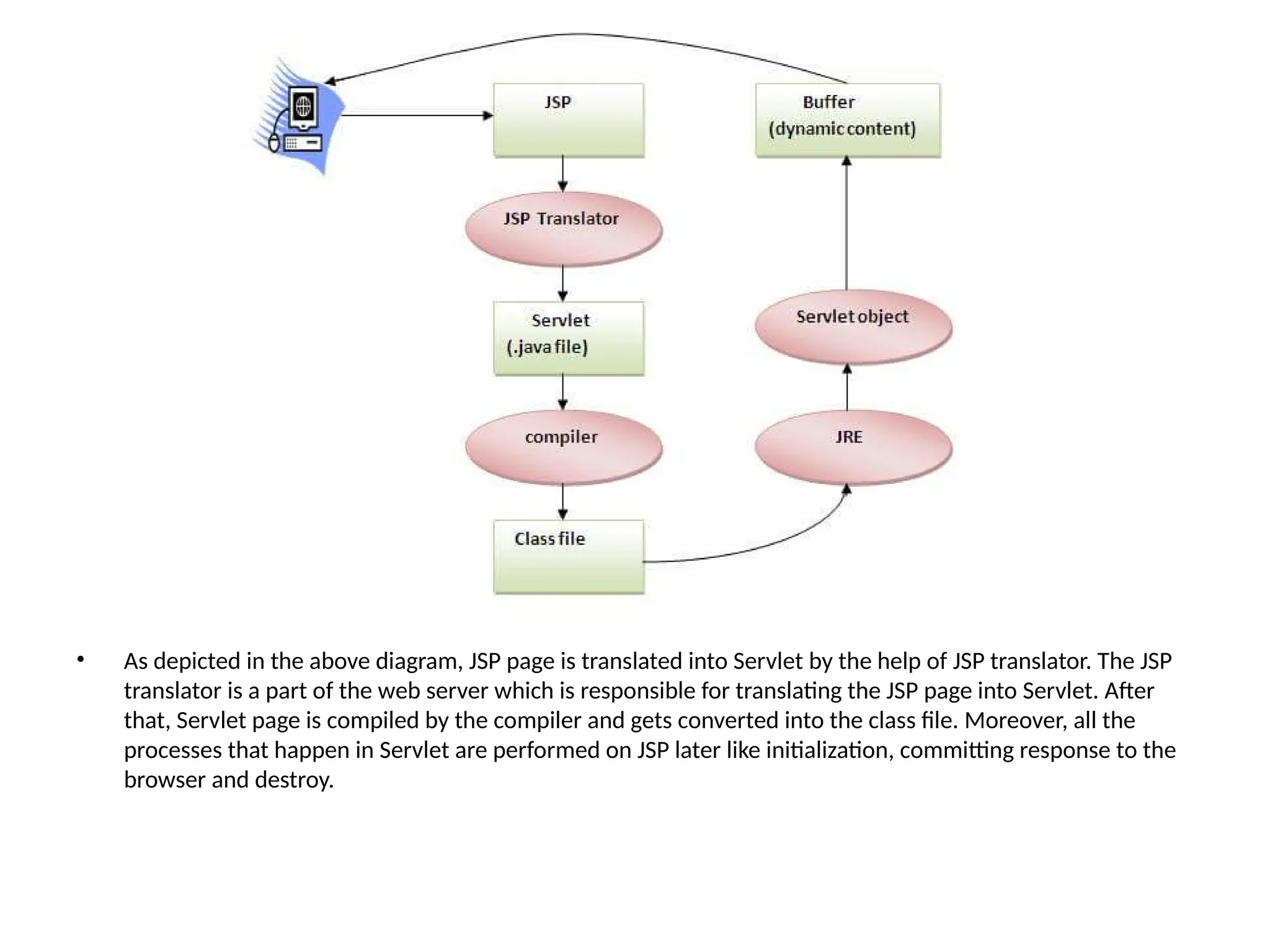 • As depictedin the above diagram, JSP page is translated into Servlet by the help of JSP translator. The JSP