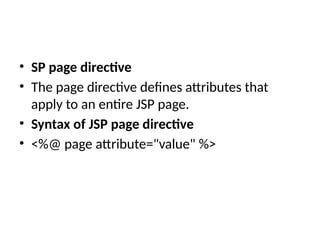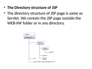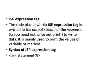 Servlet in JSP. In addition to, we can use implicit objects, predefined tags, expression language