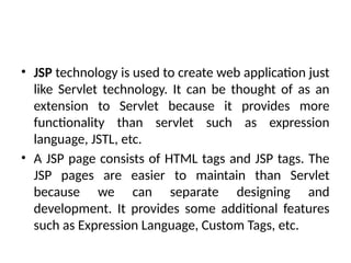 • JSP technology is the extension to Servlet technology. We can use all the features of the