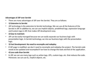 • There are many advantages of JSP over the Servlet. They are as follows: