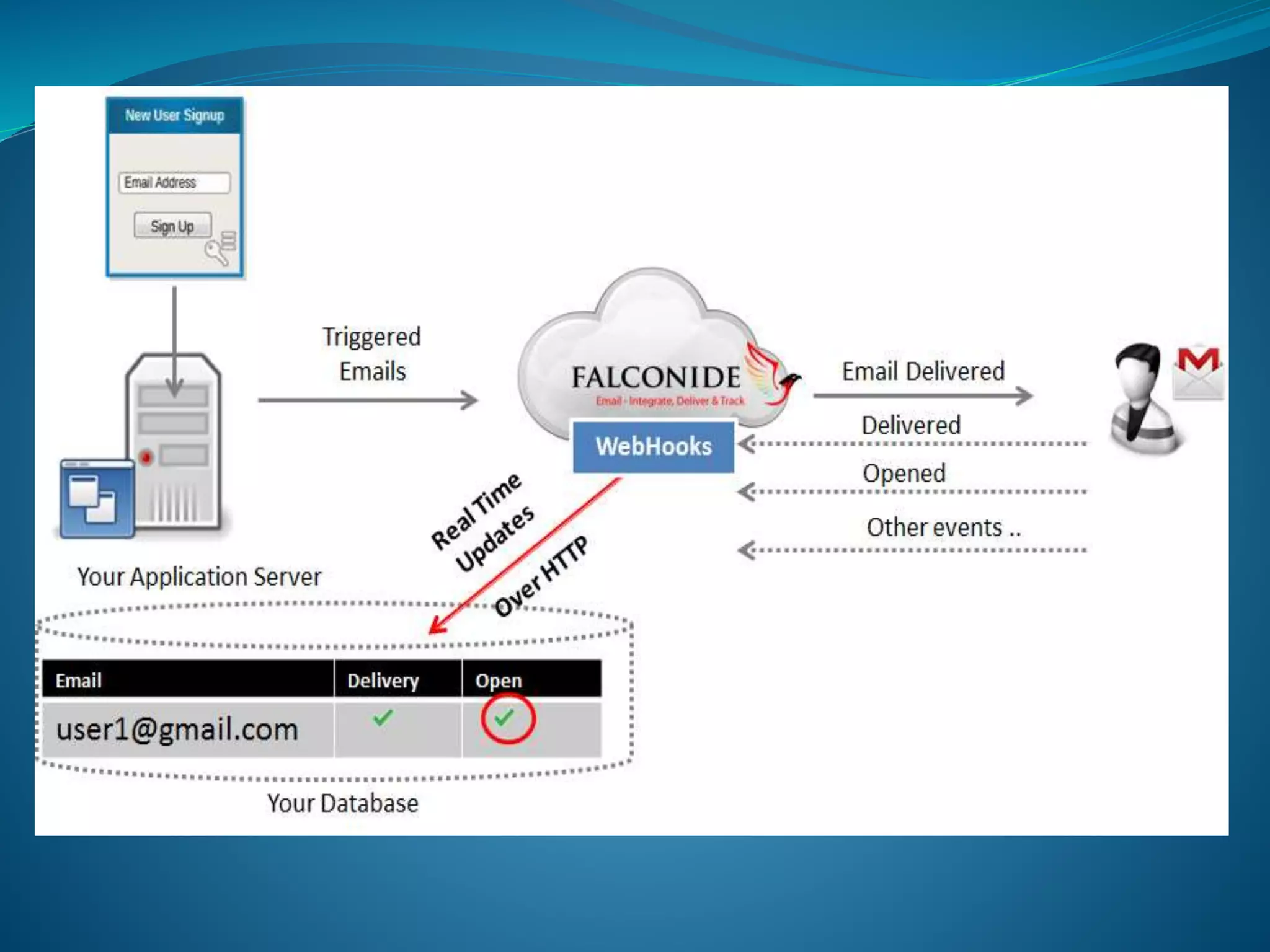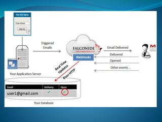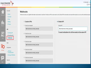 The document discusses how webhooks from Falconide can be used to update a company's CRM system when prospects click on links in marketing emails. Webhooks allow a third party system like Falconide to POST data to a user-defined callback URL when certain events occur, like a click. The document provides instructions on configuring webhooks in Falconide and describes the data format and common event types that will be POSTed, like clicks, opens, bounces. It also provides a sample PHP script for collecting the webhook data.